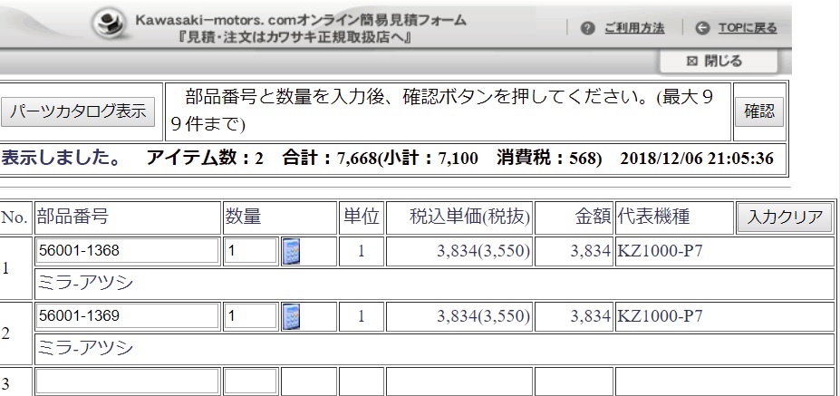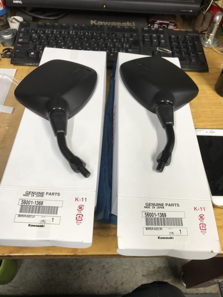 投稿日: 2018年12月6日純正部品情報 ローソンミラーのショート Z1000Rの純正ミラーと同形状のショートタイプが存在しますが、今日現在もメーカー在庫がありましたのでご紹介します。 実際はJ系ポリスの純正ミラーです。お探しの方は生産終了になる前にお早めにゲットしてください。(^^) 部品番号 56001-1368 ローソンミラーショート左 税抜き価格 3,550円 部品番号 56001-1369 ローソンミラーショート右 税抜き価格 3,550円
