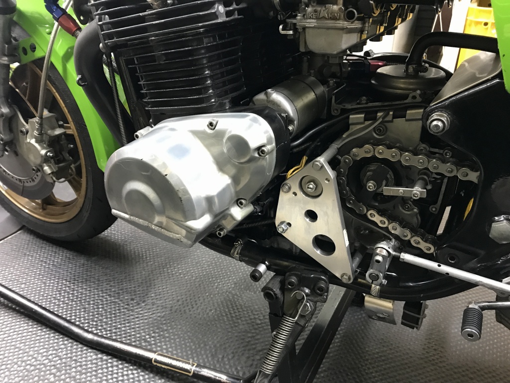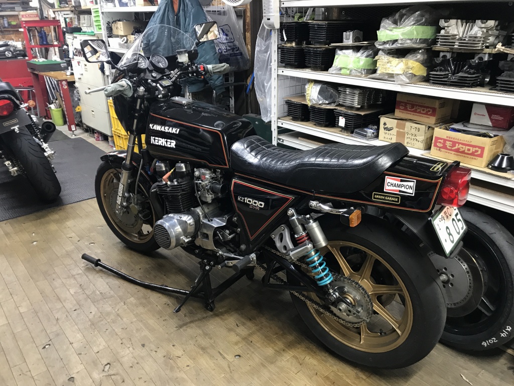 Z1000Mk2のワークススイングアーム製作・取付のご依頼です。現在はアルミ角断面の高剛性スイングアームが付いており、リヤのディスクブレーキ化も済んでいます。