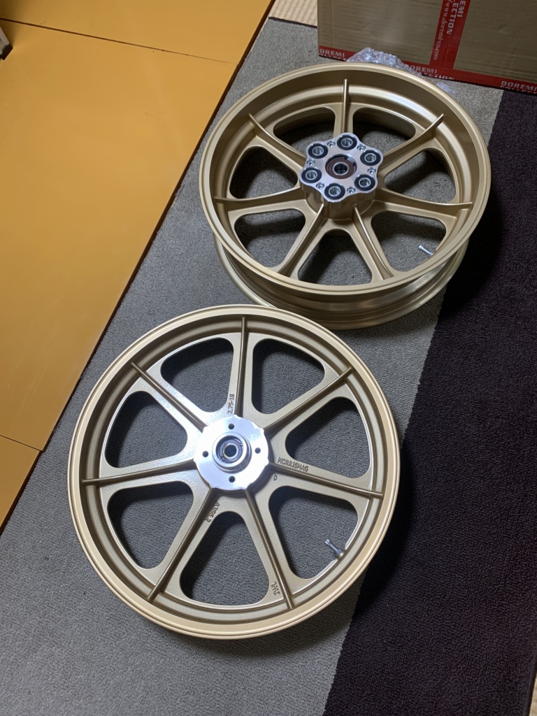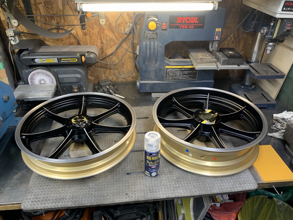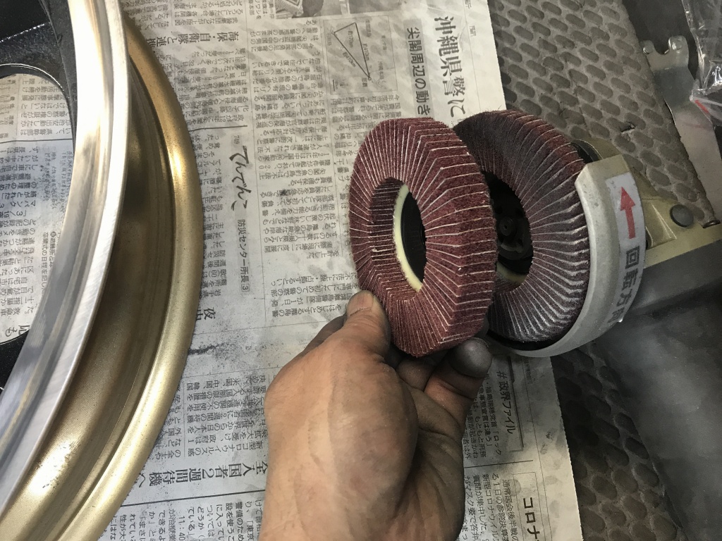 ゴールドのドレミ製新品モーリスマグを純正ホイールのようなブラックとシルバーのツートンにする作業です。純正同様にシルバーは金属地を出します。ブラックに塗ったあと、リムの部分の塗装をサンダーで剥がしていきます。