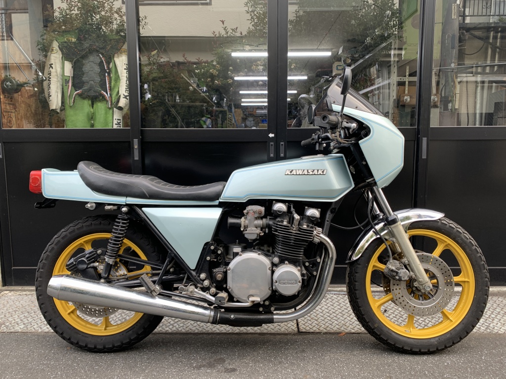 黄色く塗装された純正ホイールが目を引きますが、それ以外は極めてノーマルの部分が多い車両です。現在はエンジン不動で前後ブレーキも固着して効きませんが、10年前までは元気に走っていたそうです。