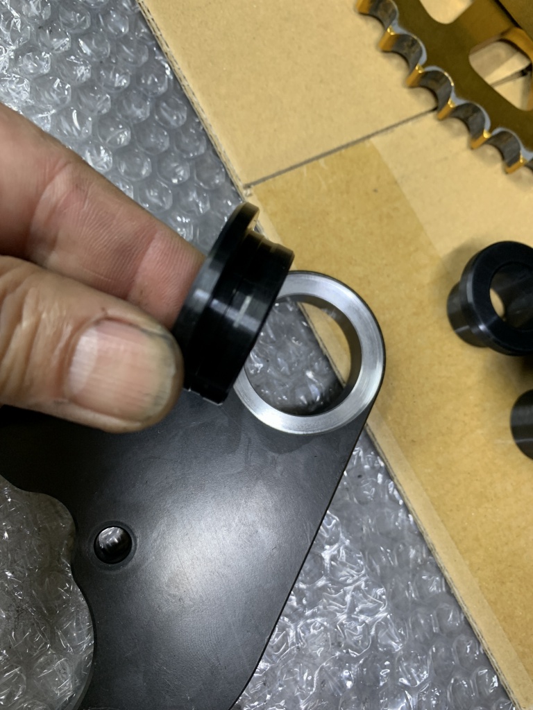 キャリパーサポートはトルクロッドをフレームから引いているそうで、走行中にスイングする構造です。そのためカラー軸受の溝をグリス溜めとしています。