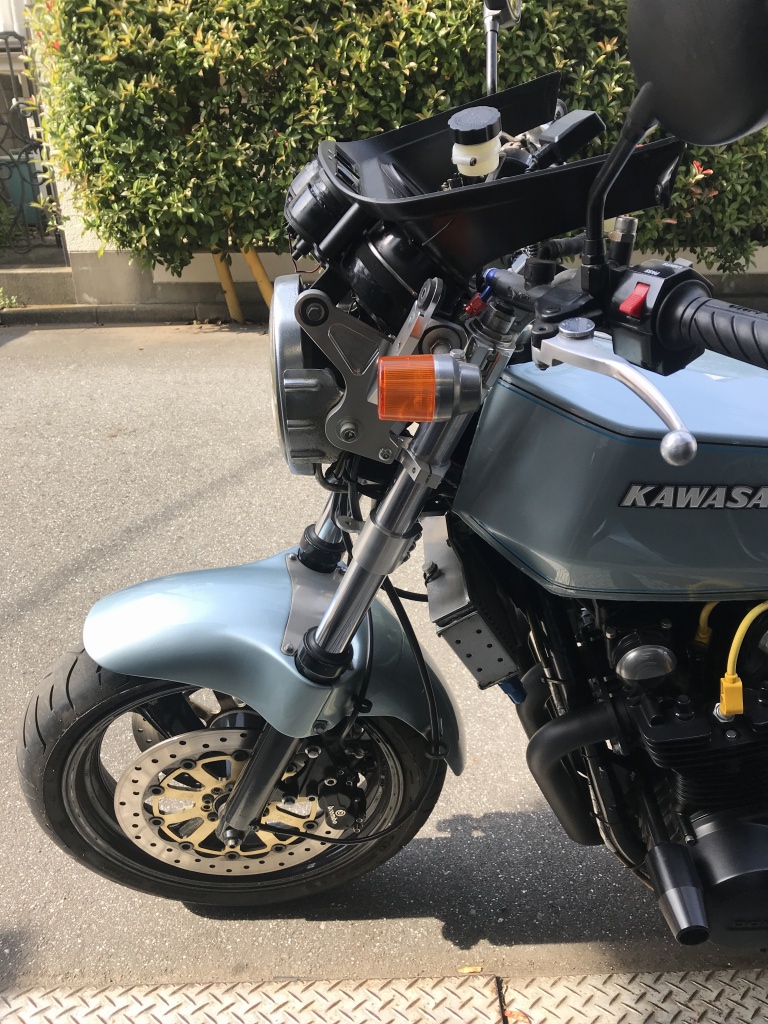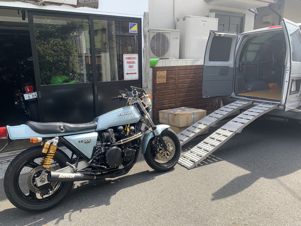 クラッチが固着して走れないとのことで、車両を引き上げてきました。トランポの天井が低いので、Z1Rなどのフロントカウル付きは積む時にミラーとともにカウルも取り外します。