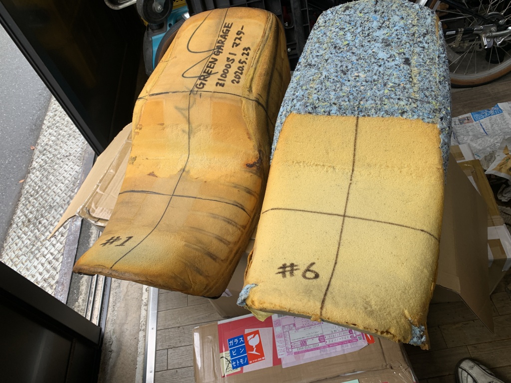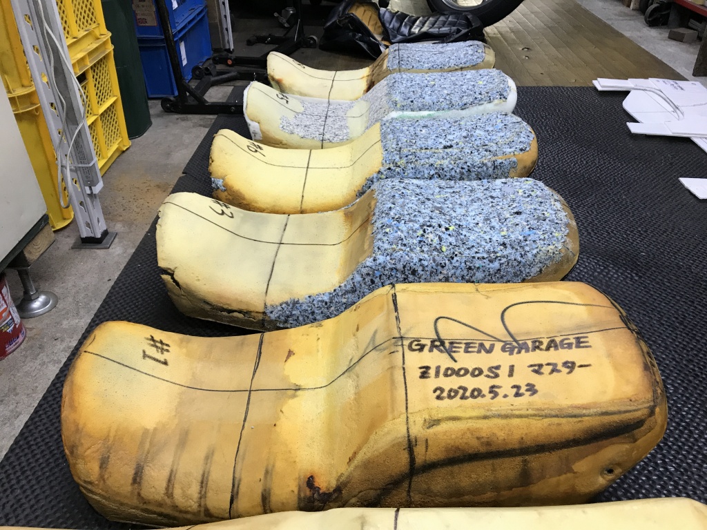 先ずは試作としてこちらの2点の表皮張りをシート工場に依頼していました。#1はいつもレースで使用している車両のシートで、元から実車S1シート形状にとても近く、前側の凸部を更に修正したものです。#6は#1と同形状にスポンジを形成したレプリカです。
