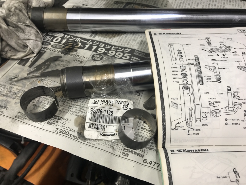 下側のブッシュは1000Jのパーツリストには載っていませんが、1100Rのパーツリストには単独で載っており、部品番号が変わって現在はGPZ750Fと共通になっています。部品番号は 92028-1126 です。