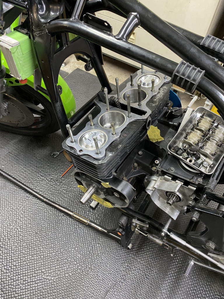 バルタイ調整とバルブとピストンのクリアランス確認が終わったので、いよいよヘッドを組み込みます。