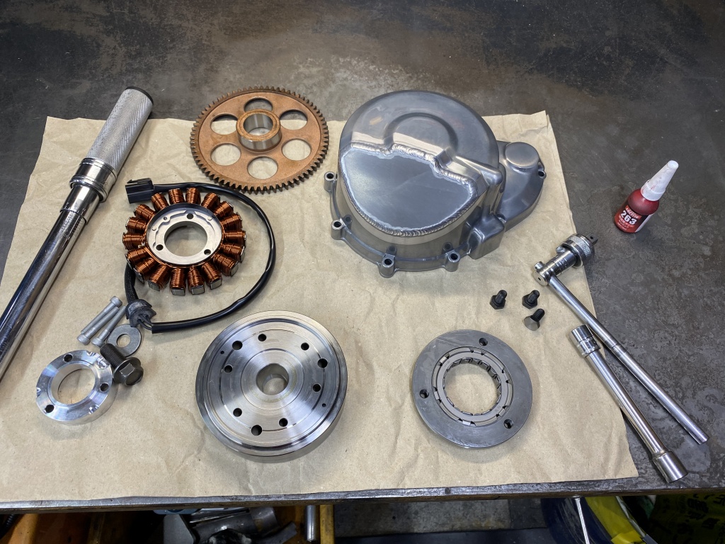 サーキットを走るので、ジェネレーターは薄型を使います。こちらがそのキットで、あるJマニアの方のオリジナルで、実績のあるキットで私もよく使用しています。ちなみにこちらはスタータークラッチ3本止めの旧型です。