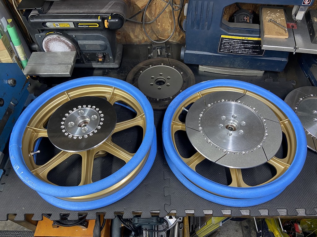 今回の2台分はモーリスマグ用として設計したものです。ホイールに仮組して寸法などを確認します。フロントの取り付けはS1と同じ6穴に設定してあり、ホイール側のネジ穴を6穴に改造して使う設計です。このあとインナーは真ん中のS1ローターの色にアルマイトします。