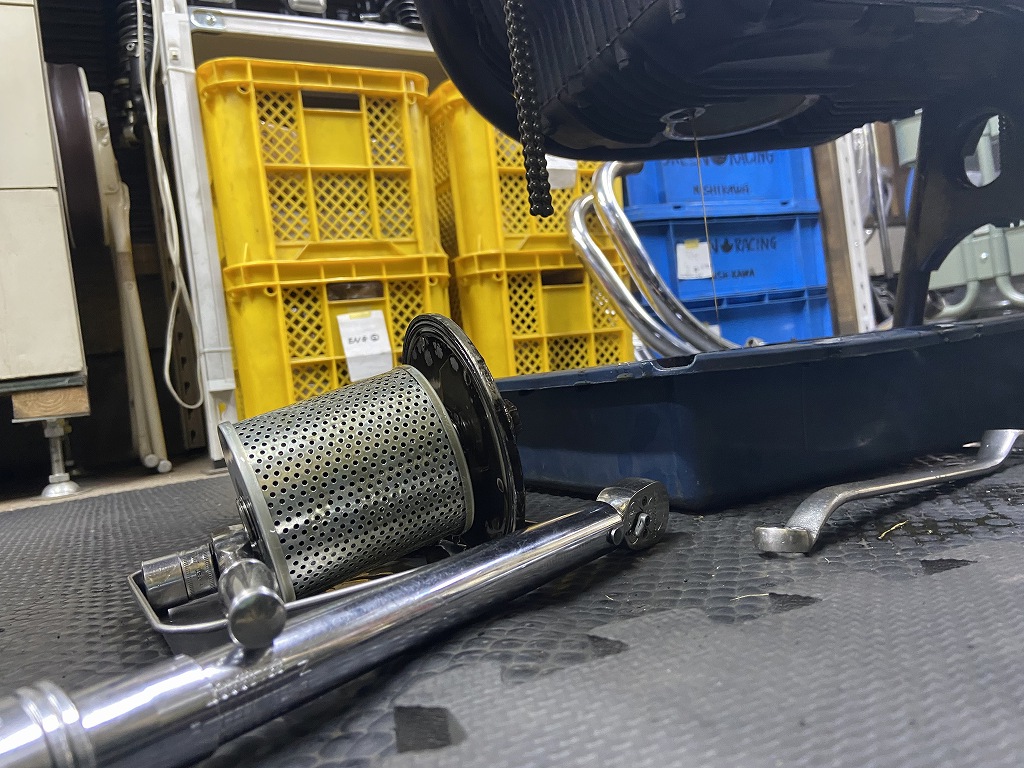 今回は腰上だけの整備なので、シリンダーを外した際に多少なりともクランクケース内にゴミが落ちてしまいます。そこでこの段階でオイルを抜きます。ついでにフィルター交換も。