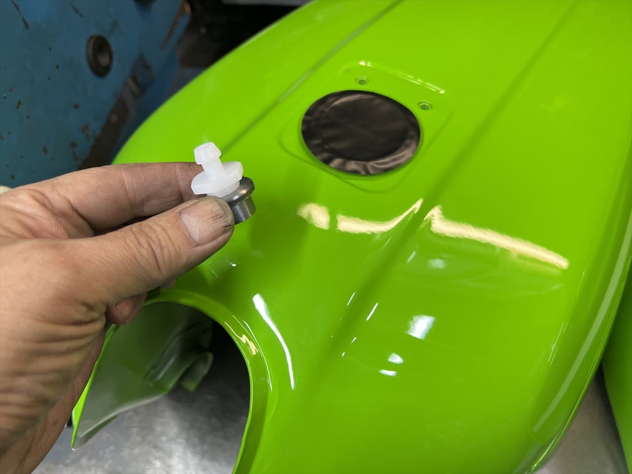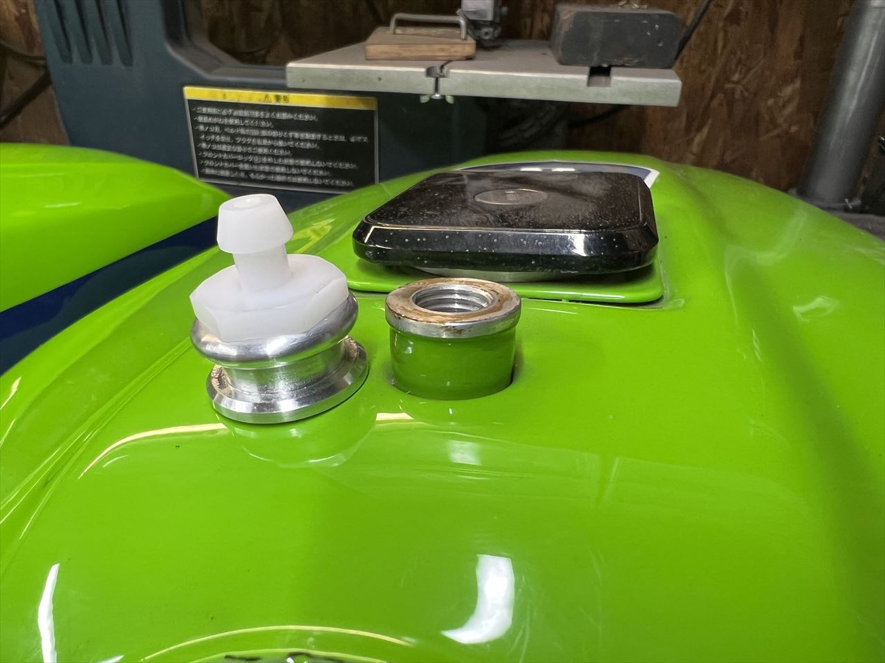 タンクをワークスS1仕様に加工します。タンクはビーター特注のアルミ製とのことです。