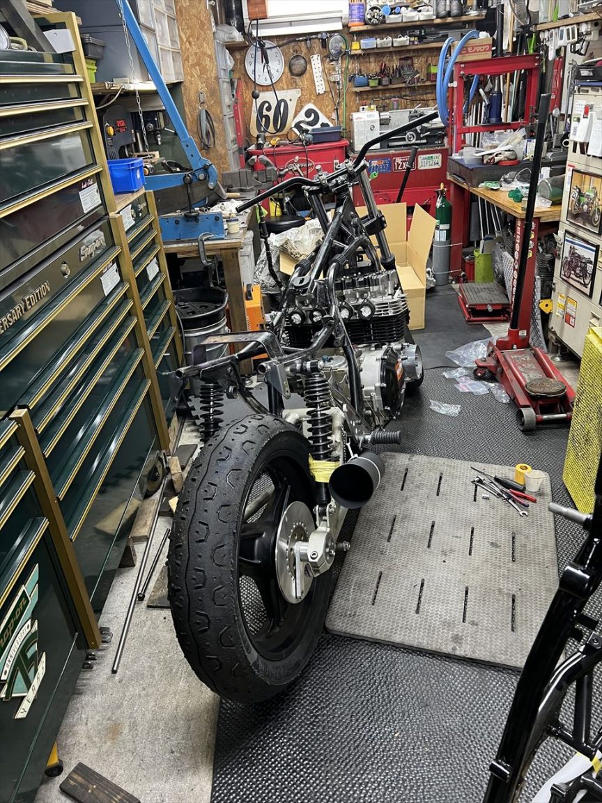こちらのZ1100-B2、デモ車なので日々仕様が変わったりします。現在はノーマルスイングアーム加工の鉄S1スイングアームが付いています。