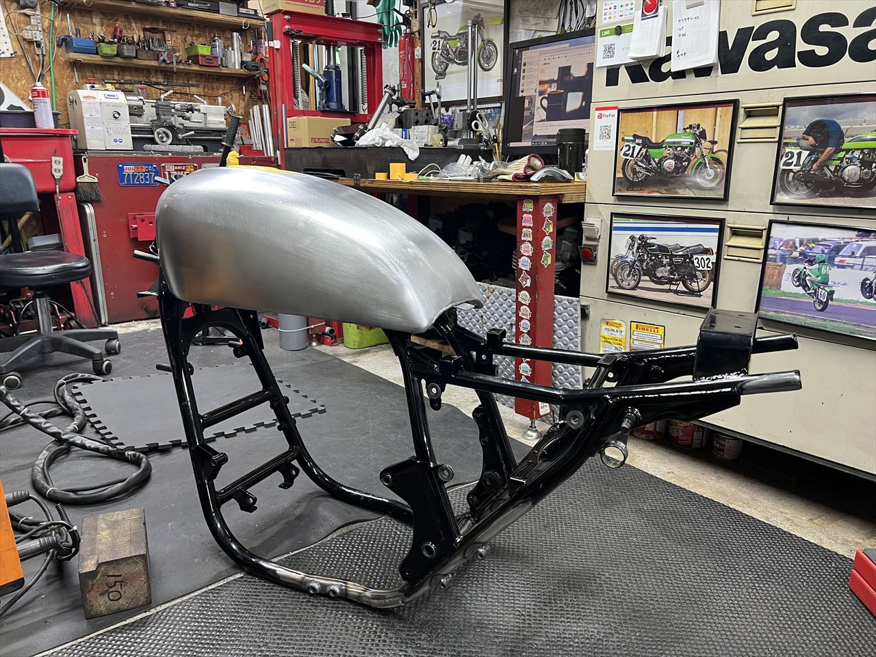 お持ち込みのアルミタンクを載せます。こちらはTOP ENDさんプロデュースのビーター製とのこと、角タンクフレーム用に作られた丸タンクです。前側マウントの内幅が角タンクフレーム用に狭くできています。