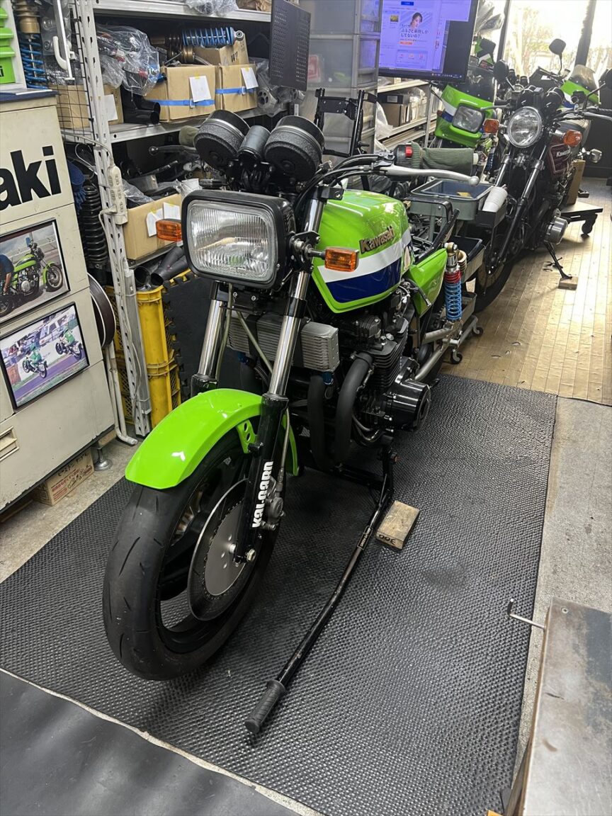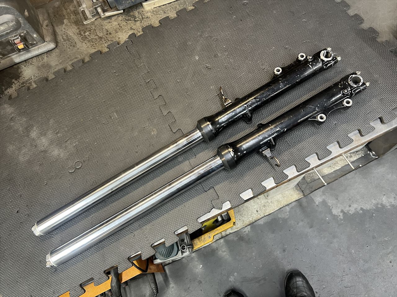 フロントフォークは見た目の形状を優先し、既存のビトーカヤバ製からお持ち込みの1000J純正に変更します。