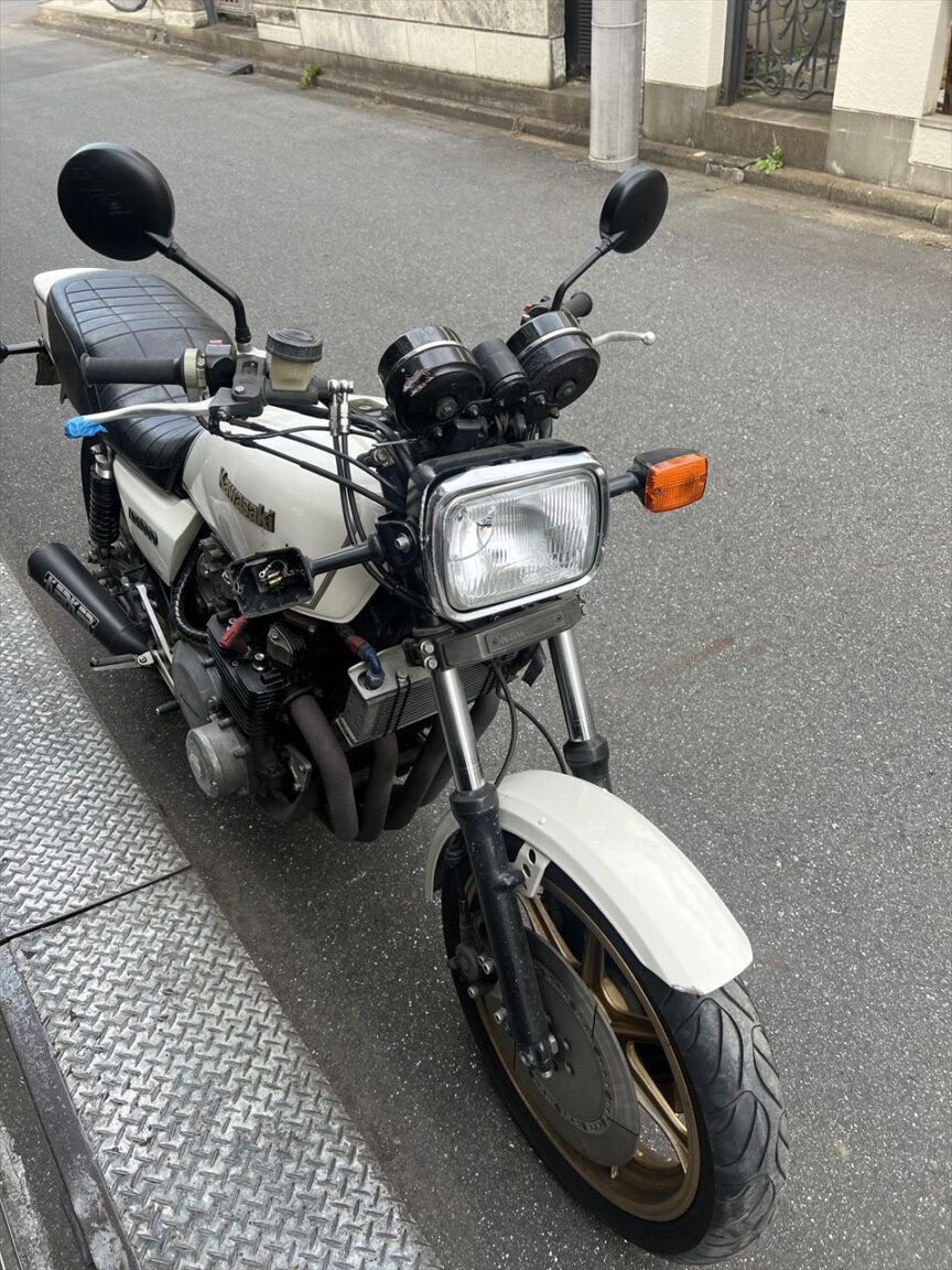 転倒は主に右前側にダメージが多いようです。ヘッドライトレンズが割れ、ウインカー、ライトステー、タコメーターなども破損しています。フォークが曲がっているかもしれません。ブレーキローターは引っかかりがあるので曲がっているもよう。