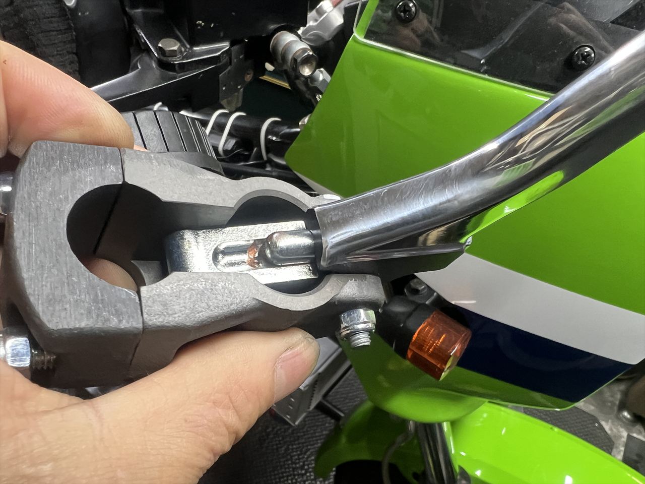 スイングアームの内側に取り付けるので、リヤホイールを外して作業します。