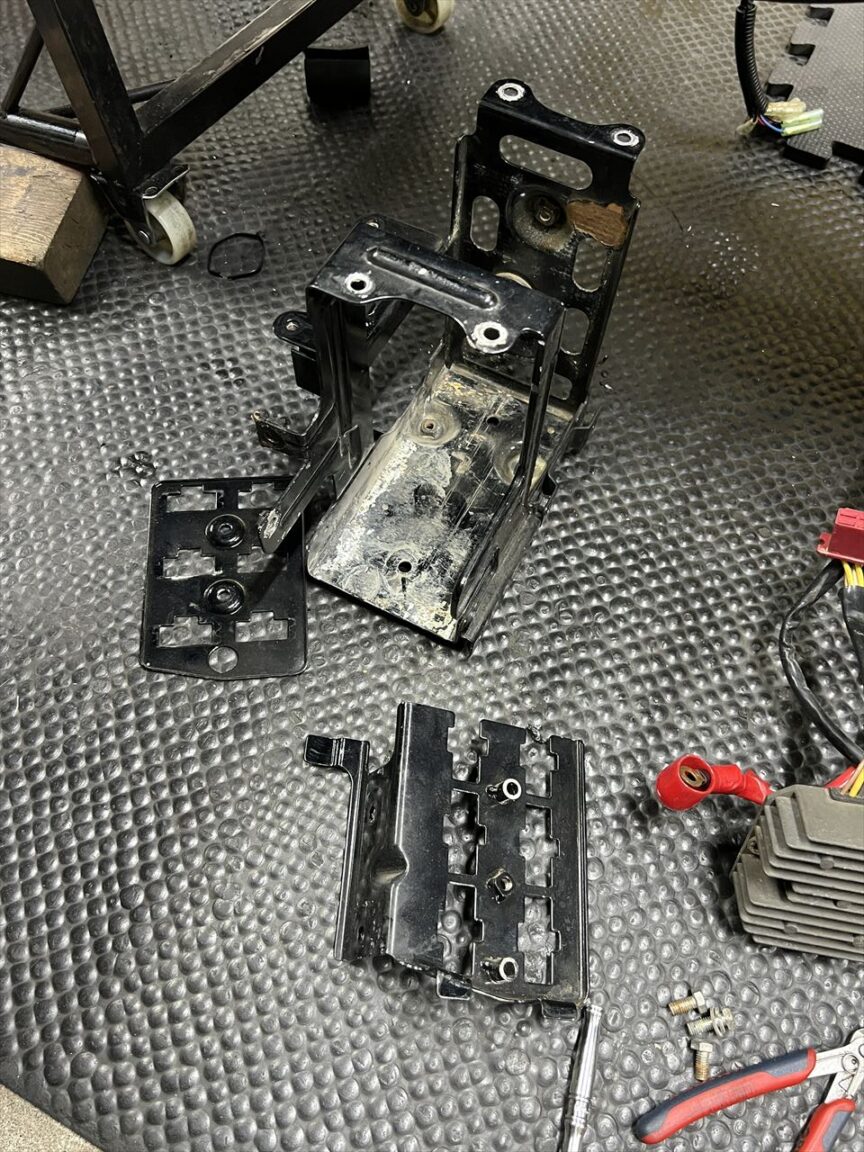 今回、フレームもエンジンも外装も全てリペイントするので、フレーム関係の小物もできるだけリペイントします。こちらのバッテリーケースは数年前に新品交換したものですが、やはりバッテリー周りは環境が悪いので腐食が始まっています。バッテリーはドライバッテリーのショーライに変更するので、リペイント後はキレイが長持ちするでしょう。