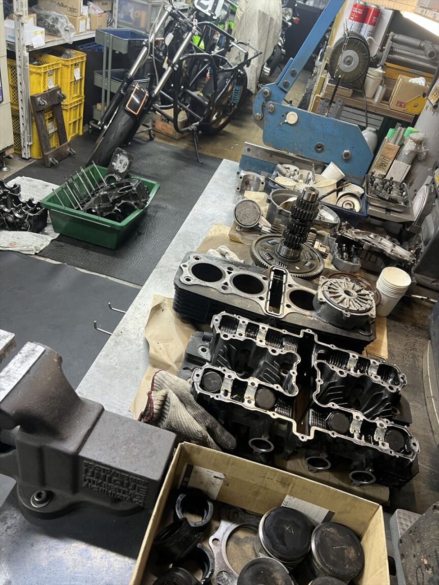 分解したエンジンを内燃機加工に出すので準備します。今回の仕様はシリンダーボアのボアアップ。現状のノーマルφ69.4ミリからφ76ミリへ拡大し、排気量は1198ccになります。ノーマルシリンダーベースとしては一般的に最大排気量となります。