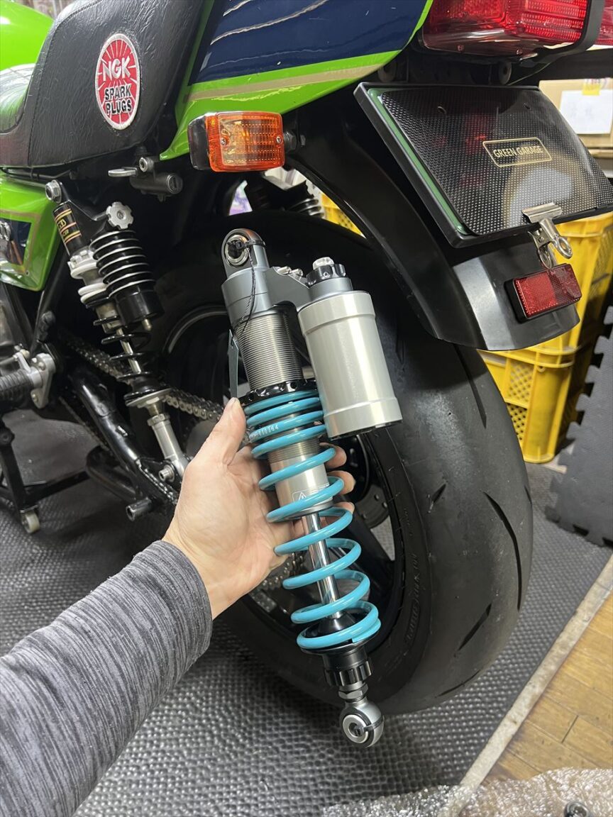 特注のGREEN GARAGE仕様のナイトロンはこちら。通常はブラックスプリングに開いていますが、今回はオーナーさんのお好みでナイトロンのイメージカラーであるターコイズブルーとしました。標準仕様に対する主な変更点は、全長を少し長くし、自由長の短いソフトスプリングで一人乗りに特化させています。一人乗りの軽い状態で、リヤサスが大きくしなやかに動くようになり、乗り心地とトラクションが向上、それでいてリヤのしっかり感も向上します。但し、タンデムの場合は大きく沈むのでその際スピードは控えめに。