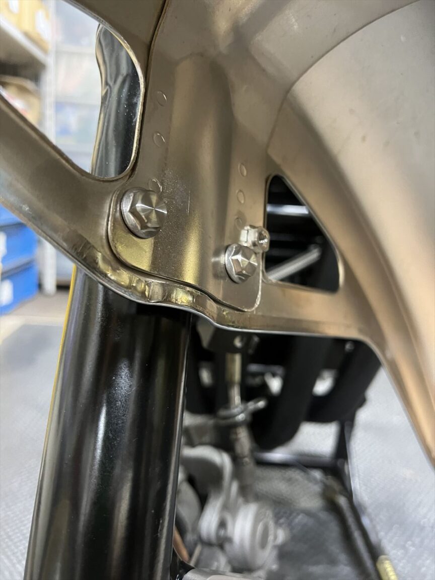 投稿日: 2025年6月21日2025年6月21日Z1000J1 K.T様 Mk2フロントフェンダー アウトプットシャフト取り出しスピードメーターセンサー 車体組み立ての続きです。フロントフェンダーはPMC製のMk2純正タイプを使います。事前にフィッティングは確認済みです。 タイヤとのクリアランスが狭いので、取り付けボルトは低頭加工済みのフランジボルトを使用します。 “Z1000J1 K.T様 Mk2フロントフェンダー アウトプットシャフト取り出しスピードメーターセンサー” の続きを読む