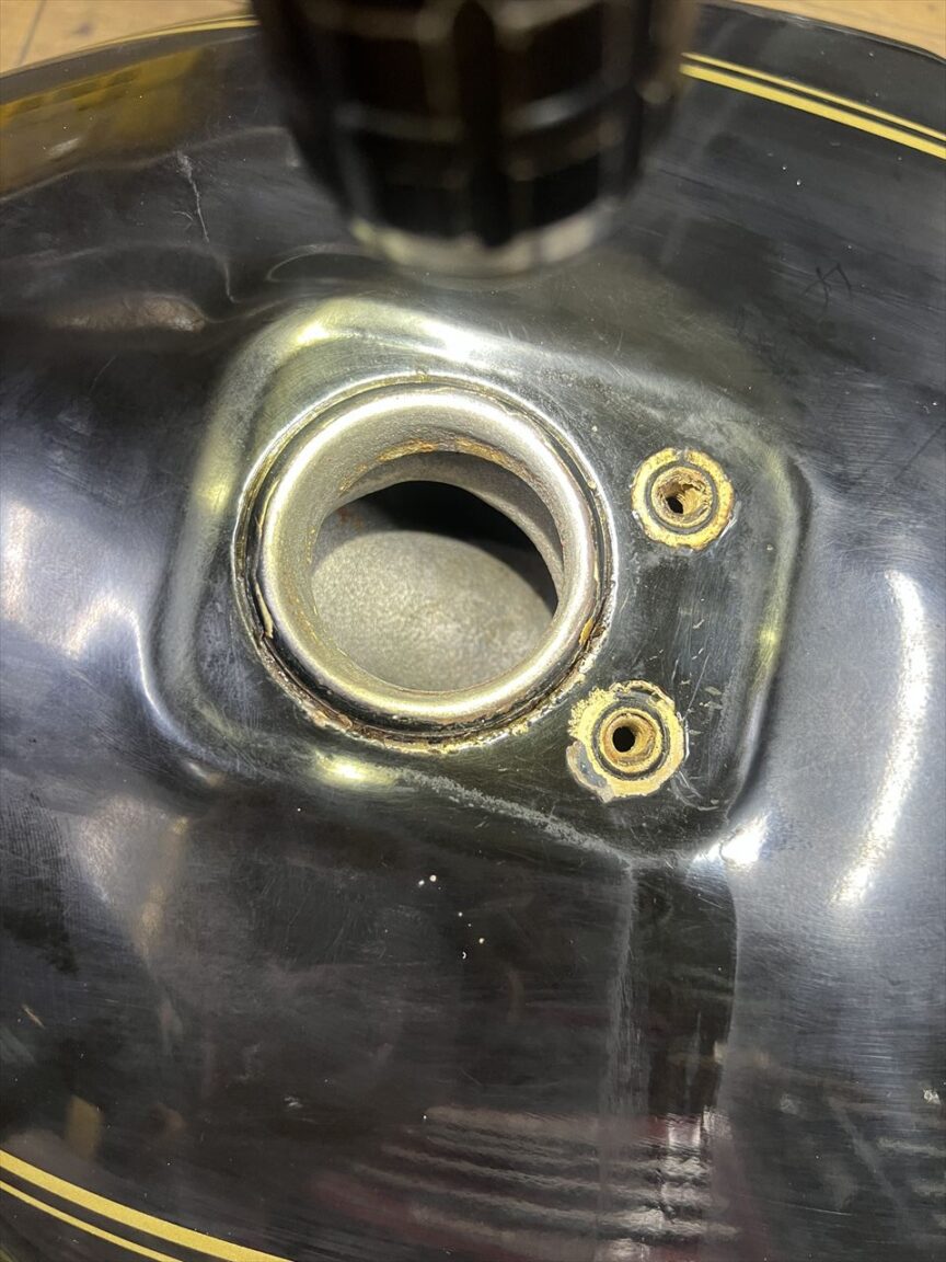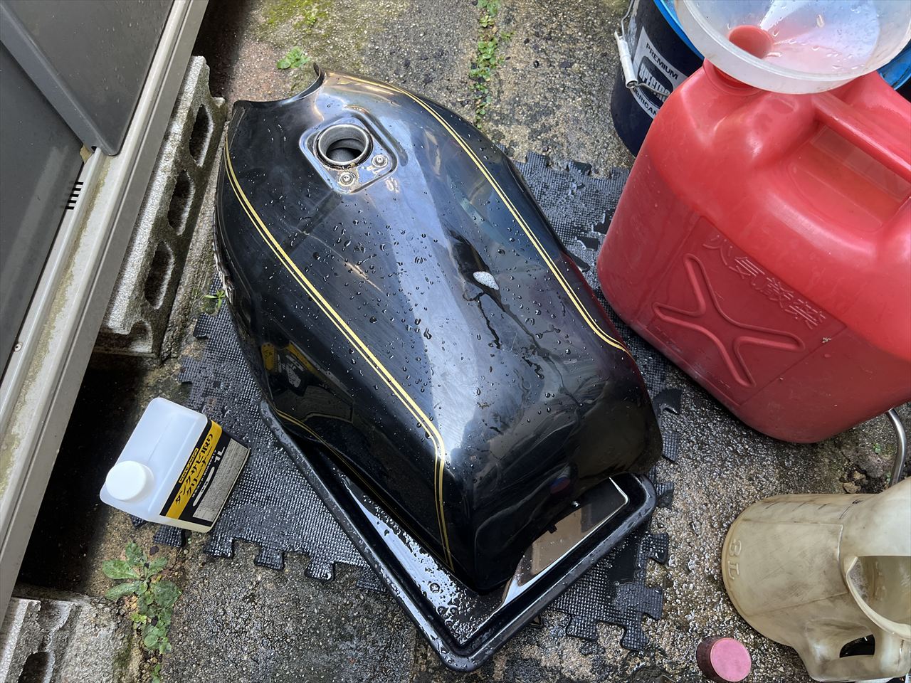 まだ所々点々とサビが残っていましたが、表面はかなりあばたになっています。もう少しサビ取りしたいところですが、サビが酷いタンクに長時間サビ取り剤を入れておくと、場合によっては深いサビが溶けてピンホールとして貫通することがあります。極わずかなサビは実用上あまり問題無いので、サビ取りはここまでとしておきます。