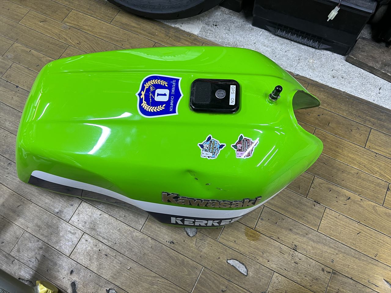 タンクはスロットルケーブルガイドなどが当たって右側が少しへこんでいます。