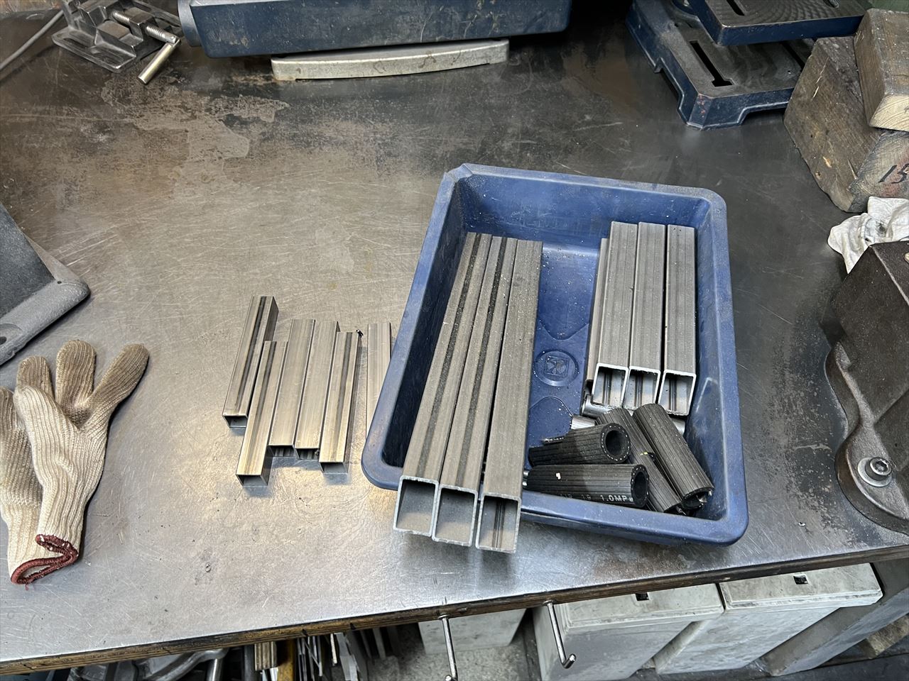 右腕のリハビリも兼ねて、軽めの作業を再開します。先ずはバックオーダーをいくつかいただいているフレームスタンドを製作します。今回は、前回の製作時に切り出しておいた3台分を先ず作ります。
