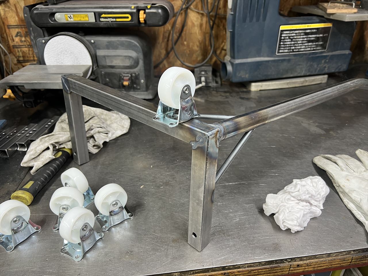 フレームスタンド製作の続きです。車輪はキャスターと組み合わせるやつの固定輪を溶接で取り付けます。台座を付けてビス止めでもいいのですが、特に消耗するものでもないし、製作コストを考えて溶接にしています。