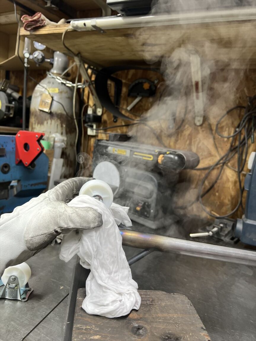 ナイロン車輪の物を使うので、溶接の熱で車輪が変形しないように、素早く溶接して直ぐに濡れたウエスで冷やします。