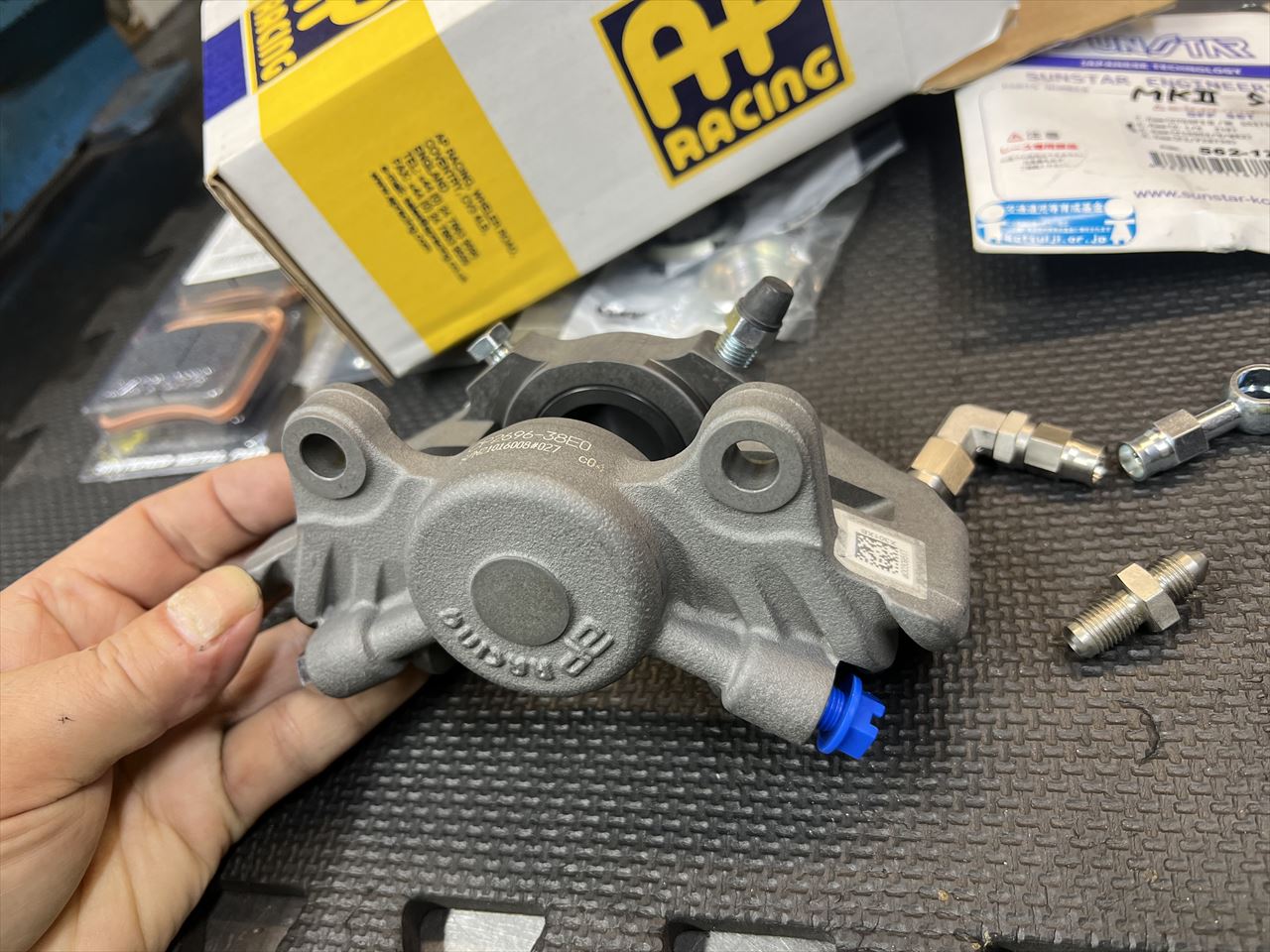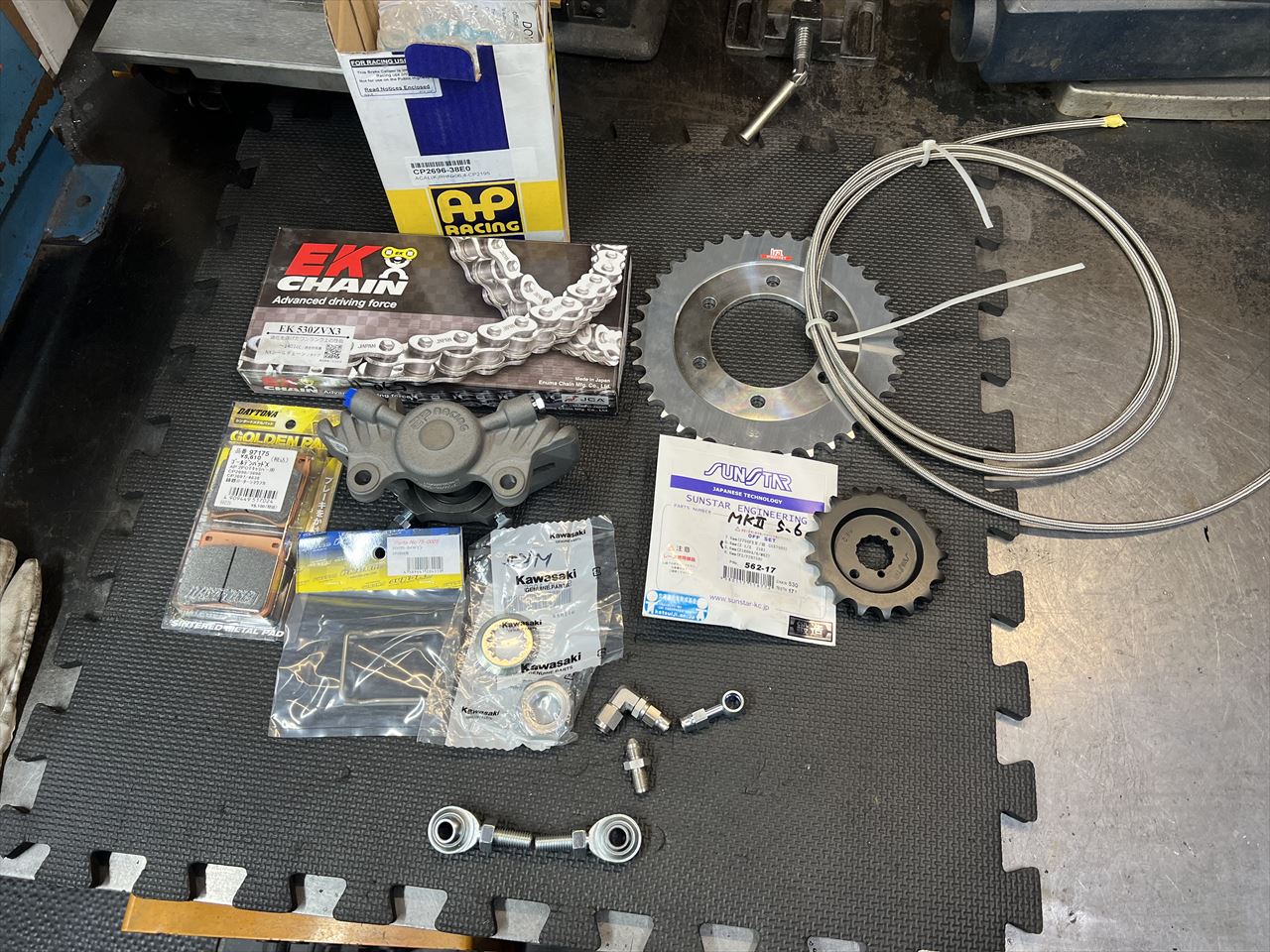 Z1000Mk2用ワークススイングアームの製作をご依頼いただいたのと同時に、リヤブレーキ周りも製作することになりました。とりあえず在庫していたパーツの中から、使う部品をまとめてみました。これにPPMCのS1リヤローターとモーリスホイールを組み合わせます。