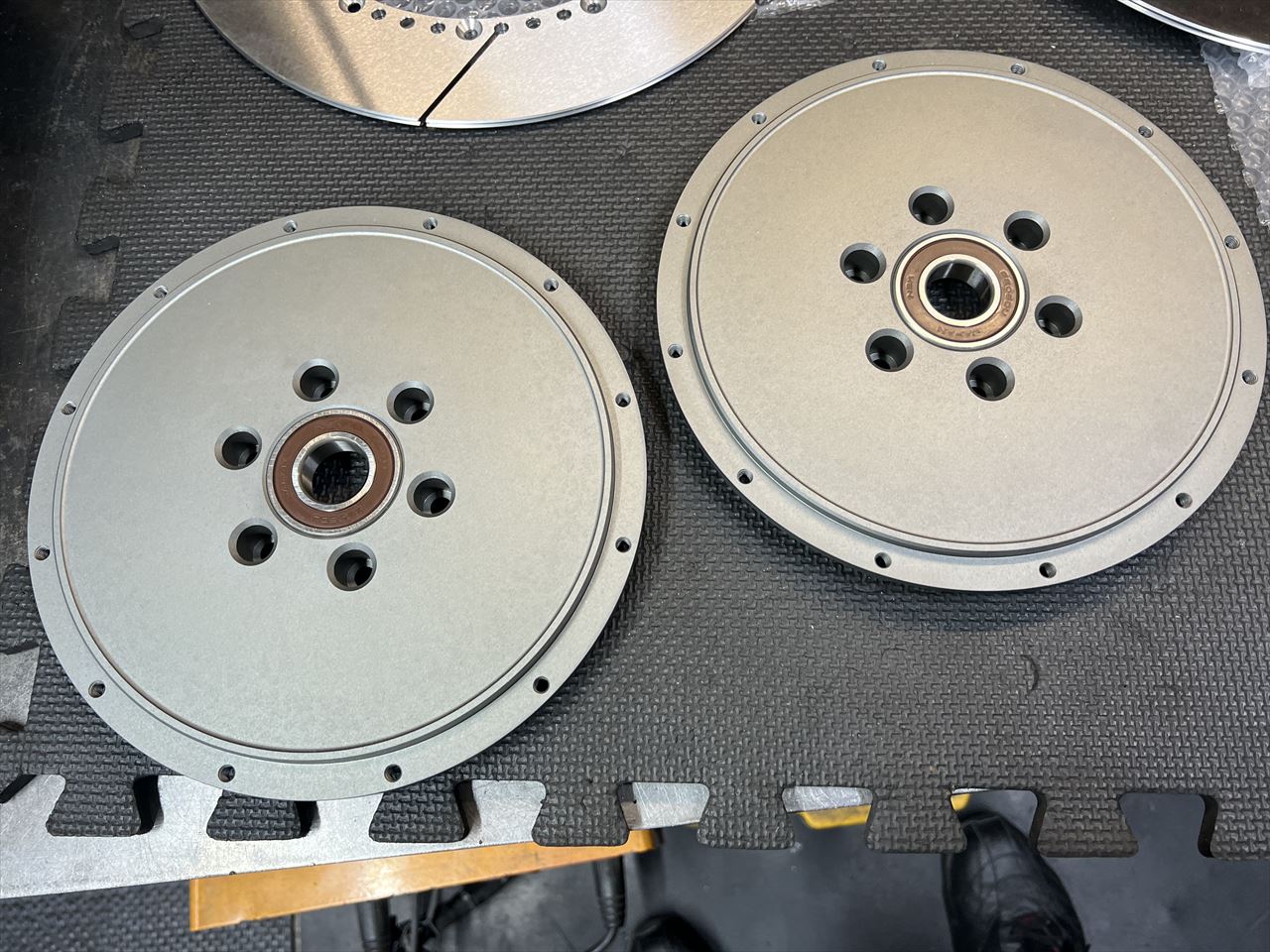S1ローターの部品が揃ったので仮組みします。アウターローターはプラスミューに特注したステンレス製で、フロントはφ330ミリ、リヤはφ234ミリです。インナーローターは、フロントが弊社オリジナルの高強度アルミ鋳物製、リヤはジュラルミン削り出しです。