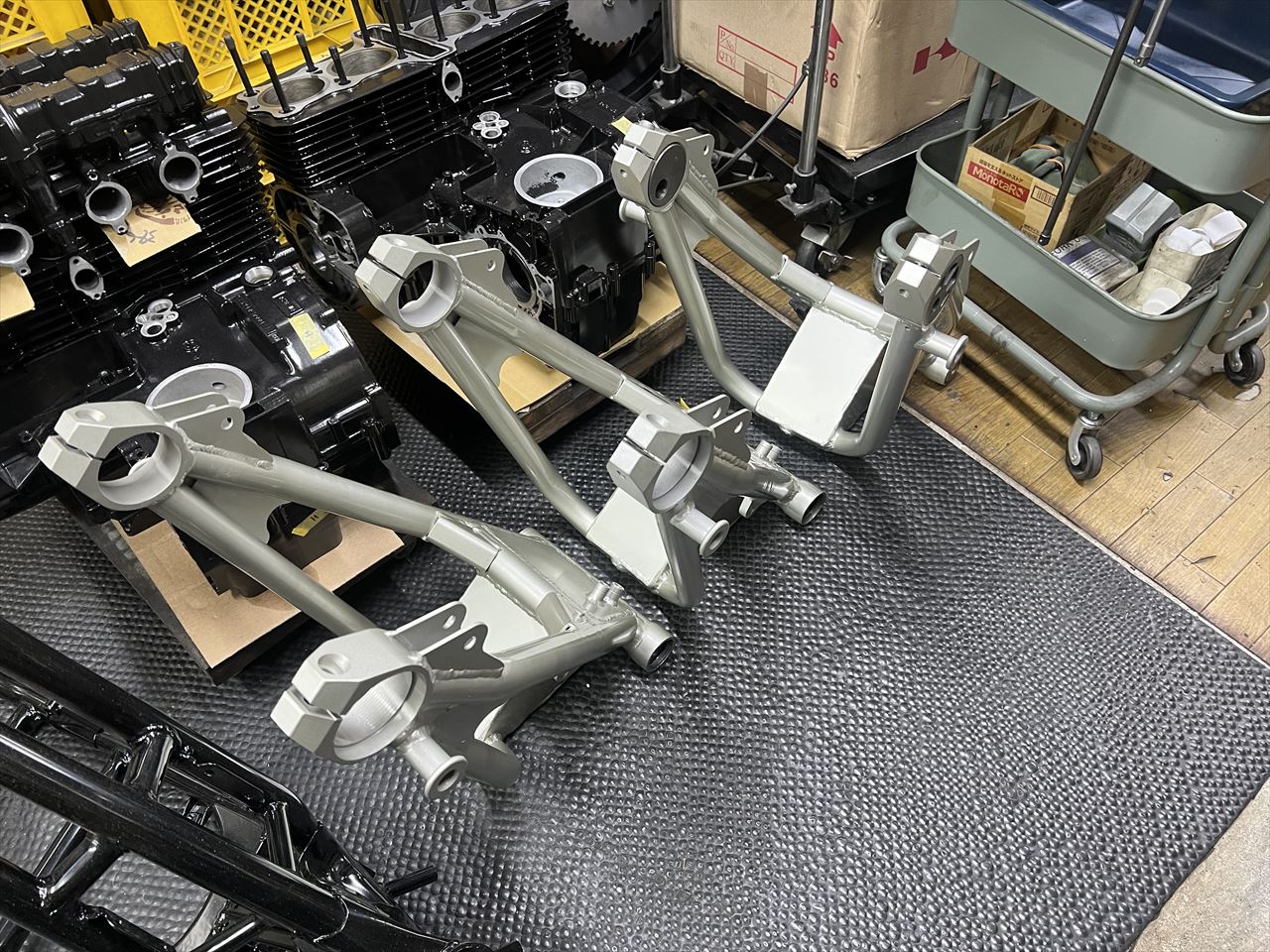 変更するスイングアームはこちら。ZRX400ベースで、2022年バージョンとしてキャッチタンクまで装着した最新バージョンです。入庫してS1仕様可中のお客様用と、過去バージョンのZRX400改S1スイングアームに追加工でキャッチタンクを追加したもの、合計3セット昨年暮れに製作しました。そのうちの1本を使います。