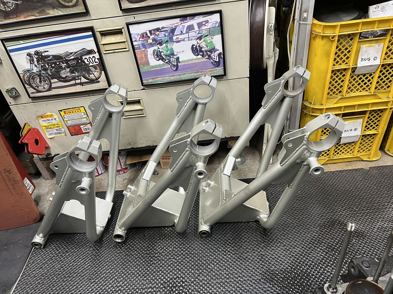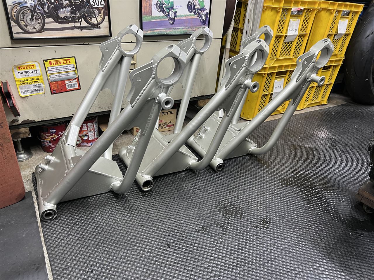 肩の手術前に溶接作業を終え塗装に出していたZRX400改S1スイングアームの塗装が完成しました。今回の3本の内訳は、2本が現在進行中のお客様車両用で、残りの1本はデモ車Z1100B2用です。