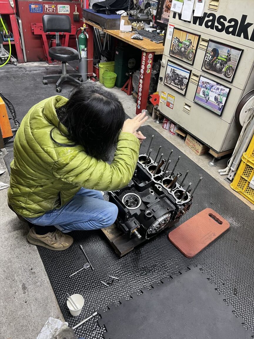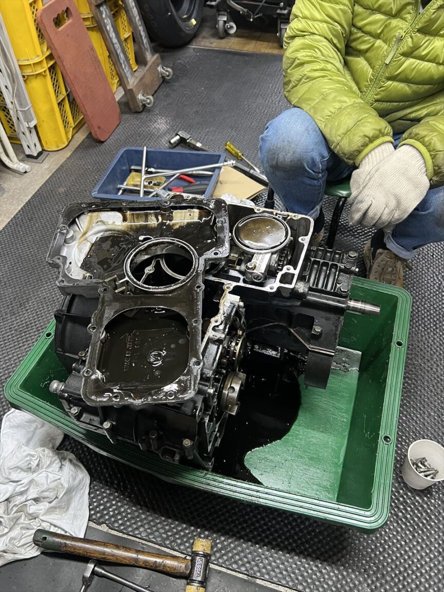 今回もサポートの方に手伝っていただきながらのエンジン分解作業です。デモ車Z1R-2用のエンジン腰下分解です。