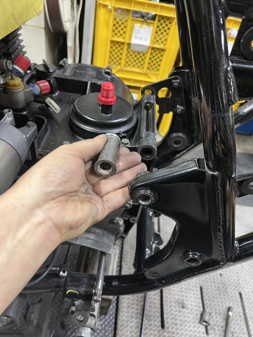 エンジンをジャッキアップし、既存のノーマルエンジンマウントを外します。ノーマルのカラーはクランクケースに接する面が狭いので、柔らかいアルミのケース側が削れてしまうのが難点。