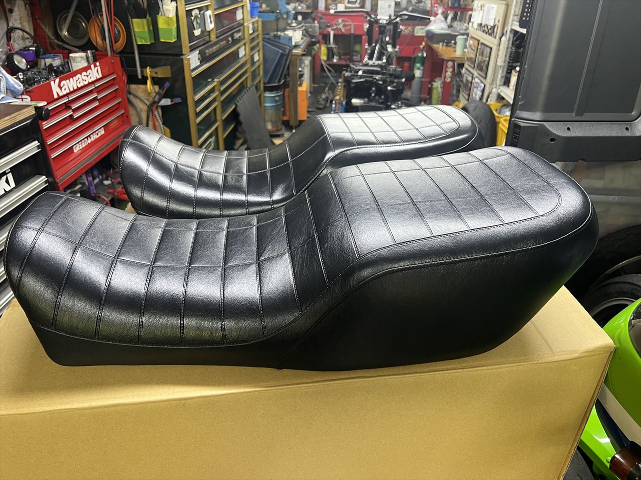 クラスフォーのスリムシートを弊社オリジナルの形で特注してみました。手前のシートがスリムシートで、奥のシートが見本にした弊社オリジナルのスプリームS1シートです。最近はノーマルシートが高騰しているので、シートコンプリートで考えるとお買い得な感じもしますね。