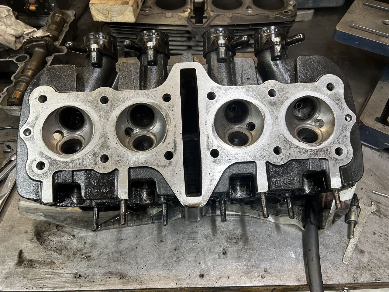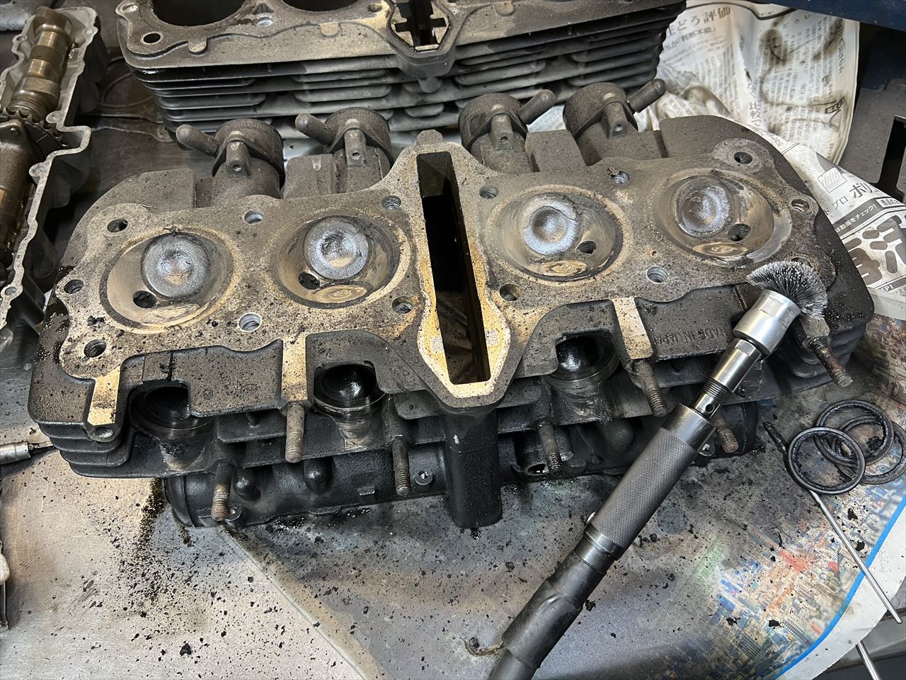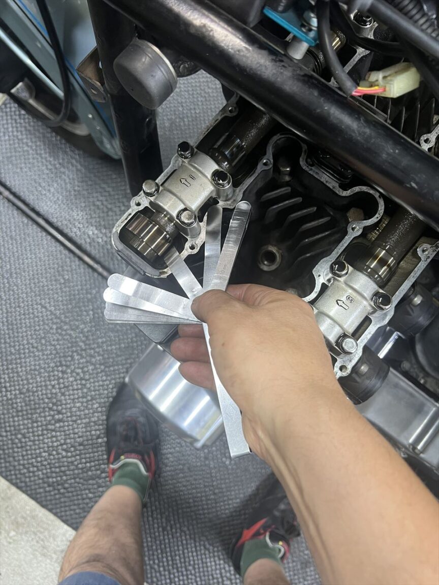 エンジン腰上分解の続きです。バルブクリアランスを計測します。これは2020年に点検した時とさほど変わっていないもよう。