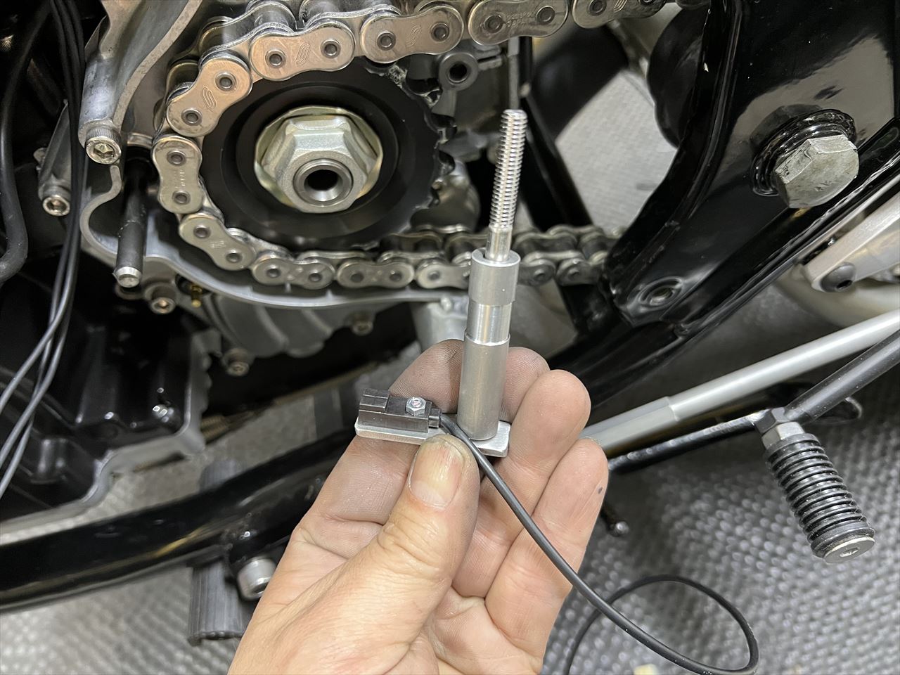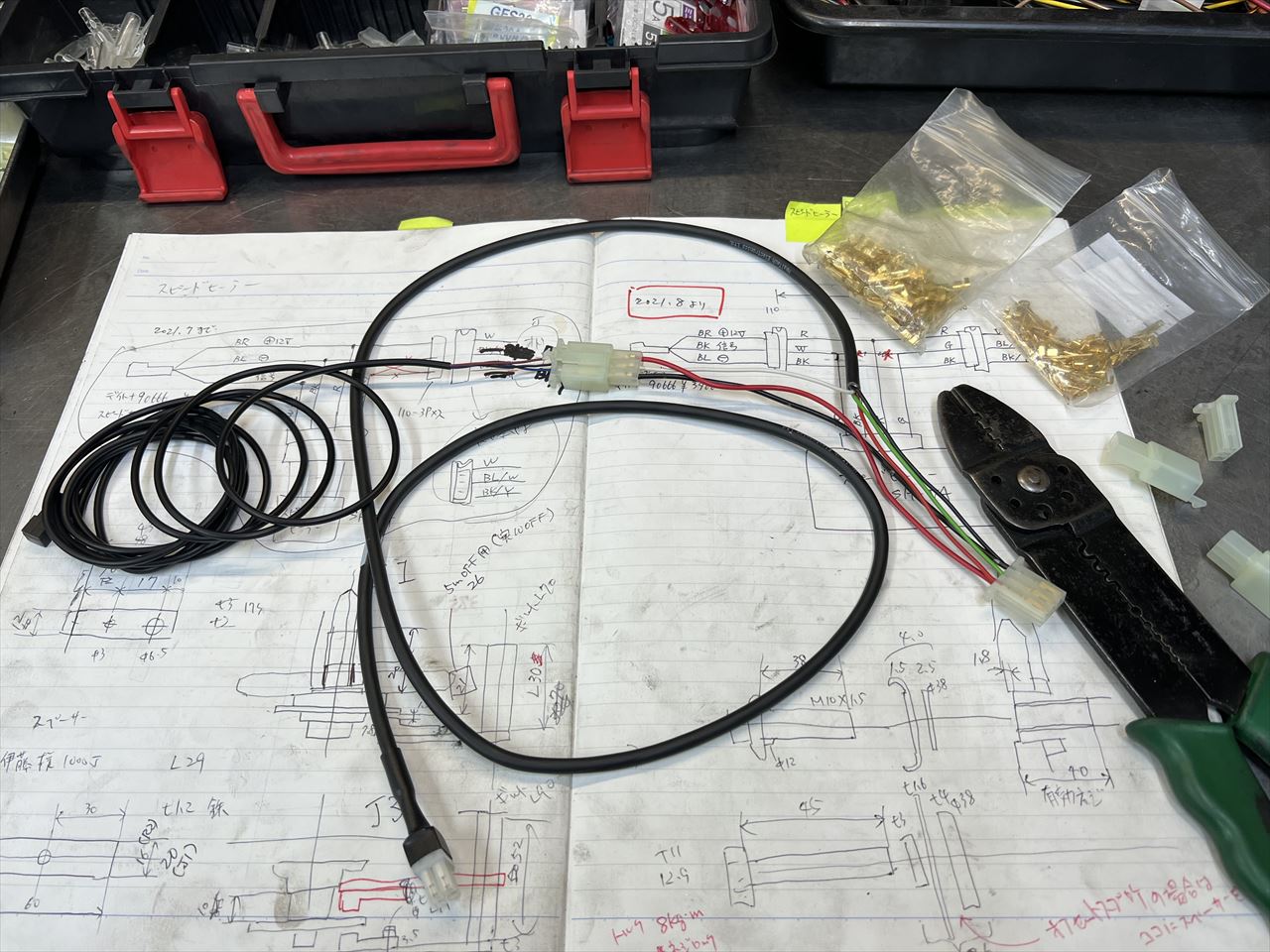 スピードメーターはZ1000R1の丸メーターを使います。弊社のS1ローターにする場合、スピードメーターセンサーは、フロントホイールからミッションのアウトプットシャフトに移設します。スピードセンサーはデイトナの市販品を使い、そこで拾った信号をスピードヒーラーで補正して純正オドメーターに送り、純正スピードメーターを駆動させます。こちらは製作したセンサーハーネスです。線の左端にセンサーが付いています。