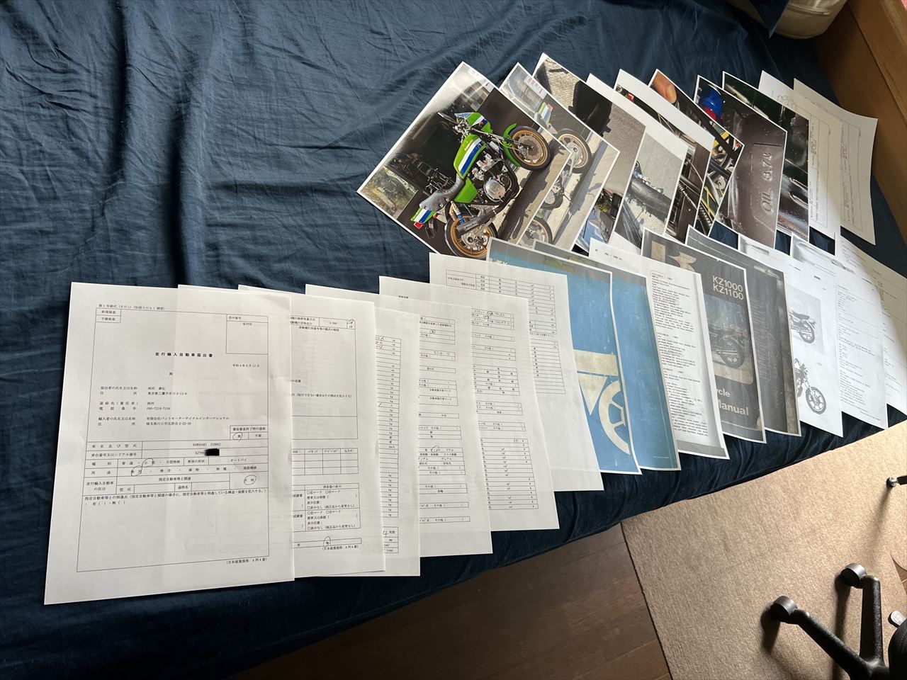 新規輸入の車両なので、登録の前に書類審査が必要です。用意した書類はこちら。「並行輸入自動車届出書」とその添付資料の数々です。