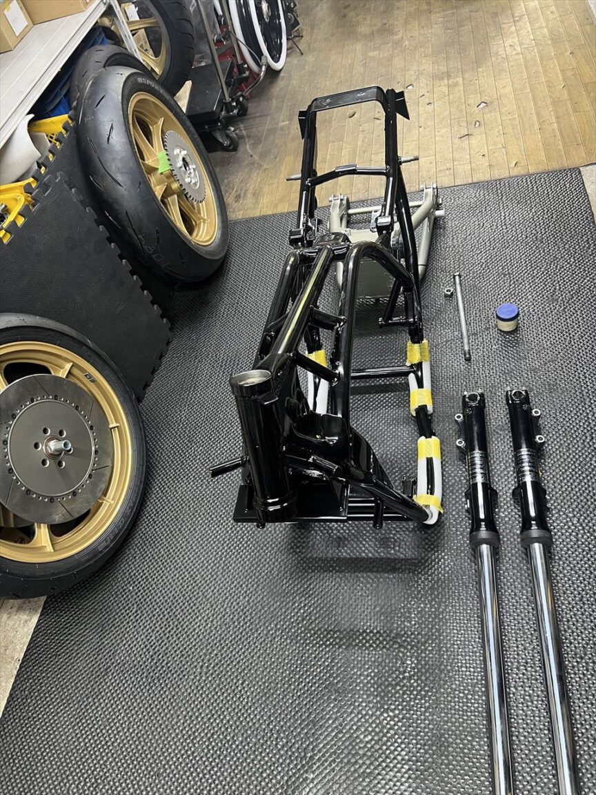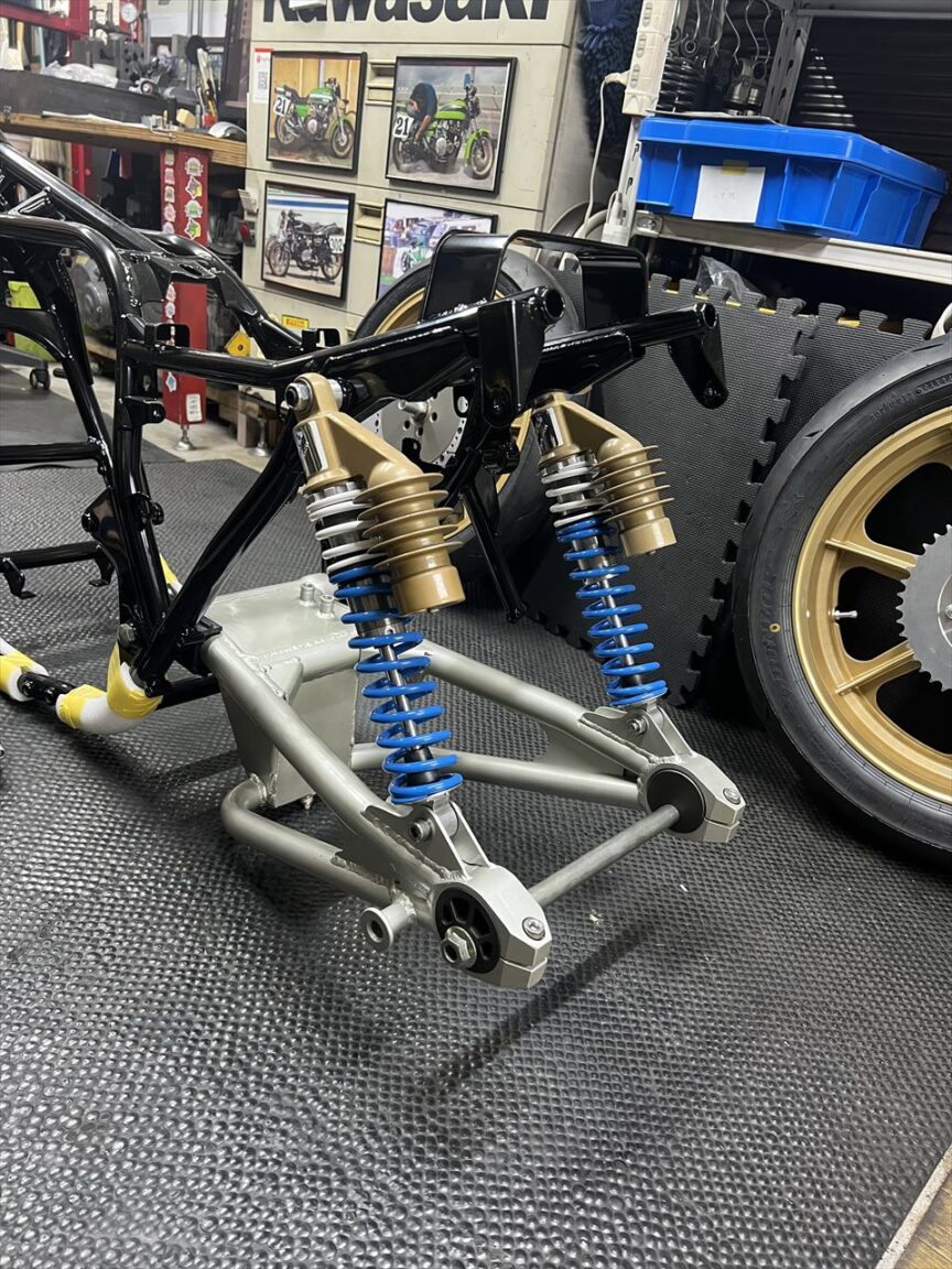 スイングアームを組み付けます。ZRX400のノーマルを改造し、サス受け、スタンドフック、エキセン、キャッチタンクをS1風にしたものです。仕上げにウレタン塗装しています。