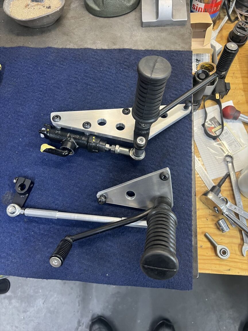 先ずはワークスバックステップの製作から。今回は、ペダルをワークスS1タイプのスチール製とします。材料を切り出し、全て内製です。