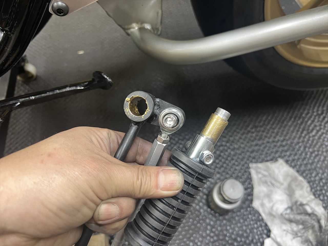 フロントブレーキは効きが少し甘く、タッチは固めなので、ロッキードのマスターのレバー比を少し変更し効きを良くします。プッシュロッドの長さを2回転短くてちょうどいい感じに。