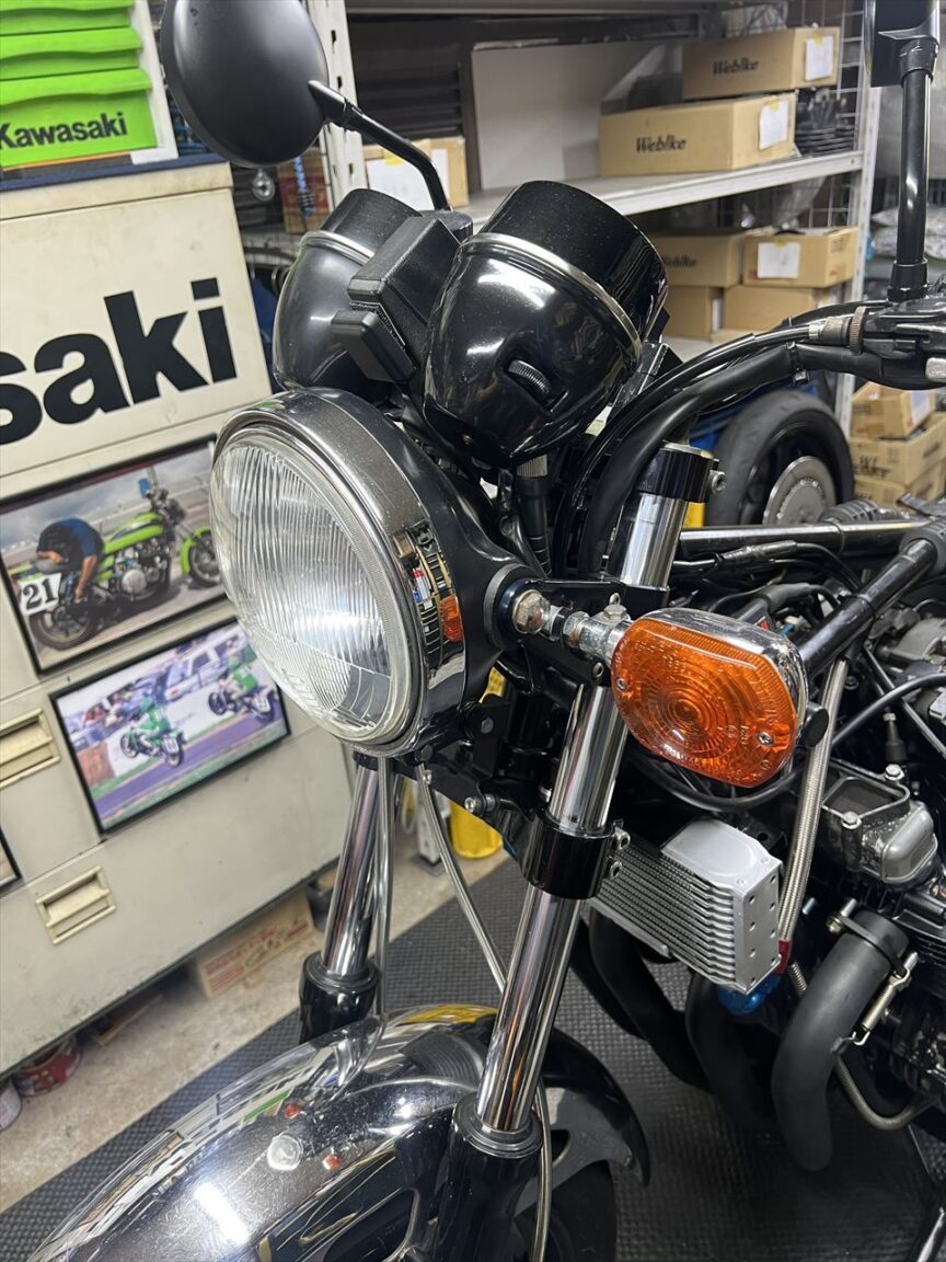 新しいハンドルスイッチと社外のメインハーネスの接続の改造が終了しました。社外のハーネスで回路図が無く、使われている配線の色もカワサキ車と全く共通性が無いので、回路をはあくするところから始めないといけないので非常に時間がかかりました。ホーンの回路も全く変わるので、新たにホーンハーネスを新設するなどの対応が必要でした。左のハンドルスイッチはW650純正で、ウインカーがプッシュキャンセルなので便利です。