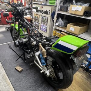 リヤの車高を上げているので、チェーンがフレームとスイングアームに干渉しやすくなっています。普通は緩衝材としてビニールチューブなどを用いますが、先日の1000Jレーサーでのテストでも効果が認められた弊社オリジナルのこちらのガイドローラーを装着します。センスタブラケットは削除しているので市販のガイドローラーは取り付けできません。こちらはワークスバックステップと共締めで取り付けるタイプになります。