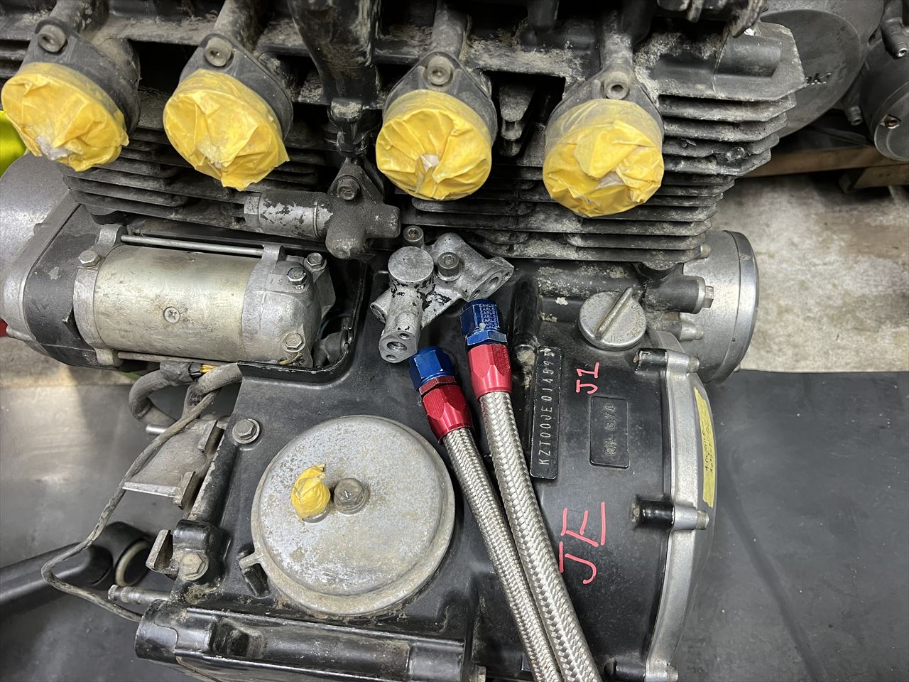 オイル取り出しを弊社特製のフラットタイプに変更します。素材は純正のオイル取り出しと溶接用AN8ユニオンです。