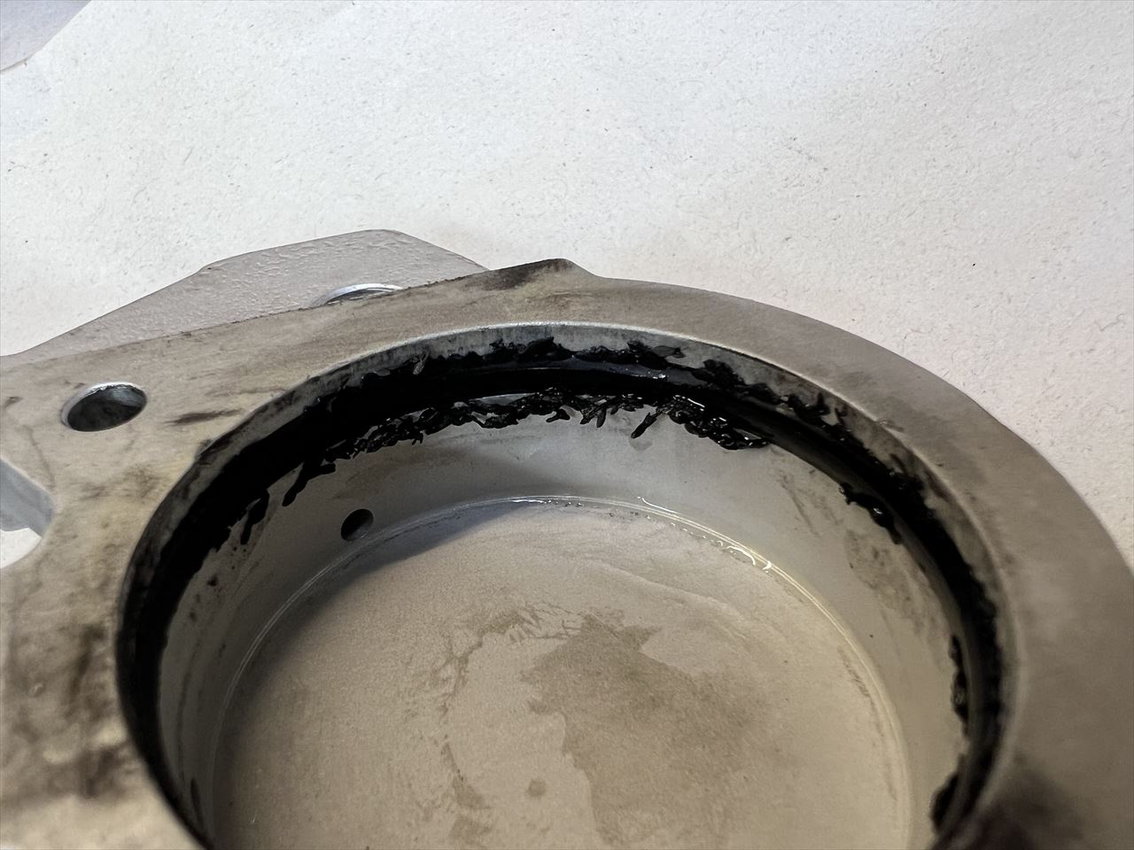 下の画像はキャリパーを分解してピストンを外したところです。このキャリパー特有の丸断面Oリング形状のピストンシールがボロボロになっているのがわかります。前後3個のキャリパー全てで発生していました。