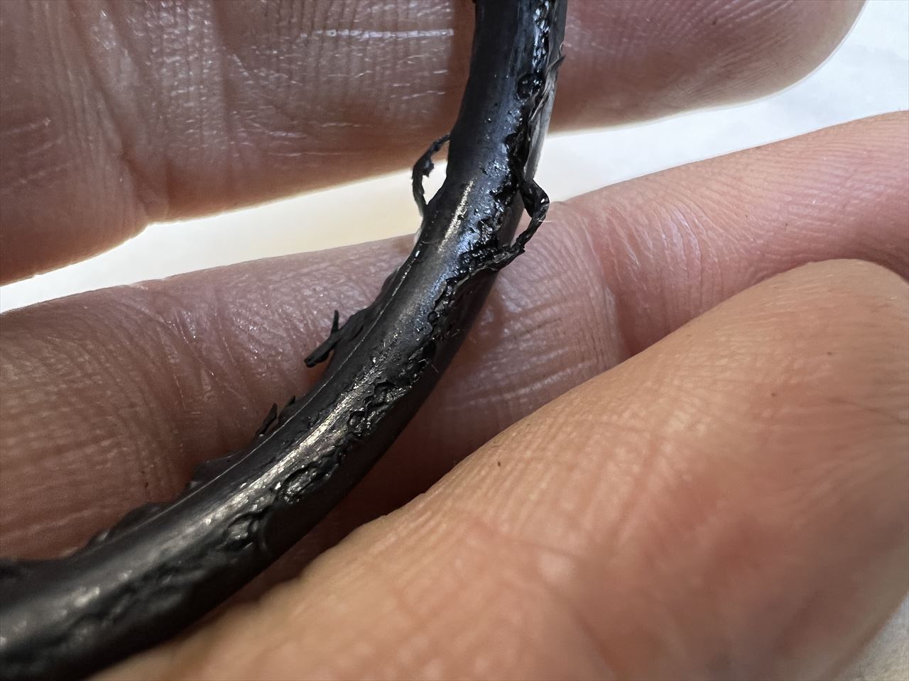 シールを取り出してみるとこんな感じです。今までフルード漏れは発生していませんでしたが、このまま使用を続けていると漏れる可能性がありました。南アフリカのメーカーにはオーソドックスな角断面のピストンシールに変更するよう初めからアドバイスしていましたが、やはり丸断面のOリングでは、キャリパーは成立しないようです。改善されない限り、今後の使用は中止します。