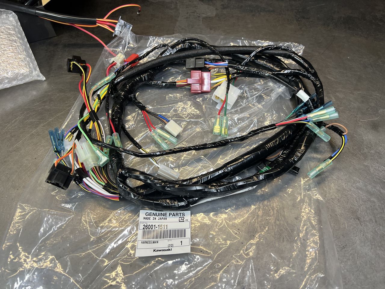 素材は今でも買えるZ1000-R2純正品です。純正品は品質が高く、各配線の色が正規の色なので、配線図との整合性があり、故障探求がし易い点が優れています。