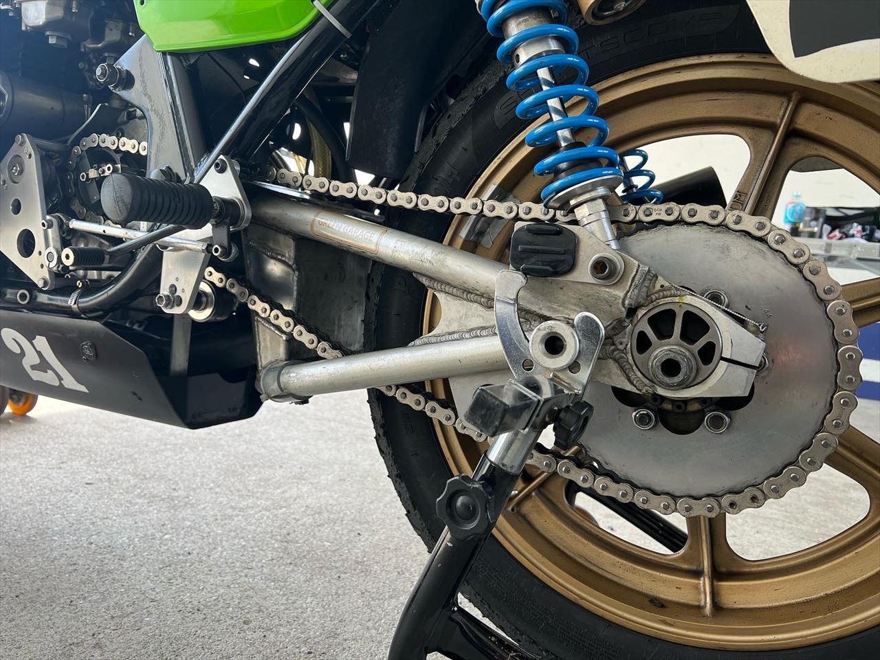 今回よりドライブチェーンガイドローラーを装着しました。1ヘアの立ち上がりやアジアコーナー後の3速シフトアップ直前など、2速での強力な全開加速体勢の際に、リヤスプロケットへチェーンが乗り上げるような衝撃がありました。リヤの車高が高いために、1Gでのチェーンの弛みはかなりあり、加速力が強いとスイングアームがアンチスクワットで下に押し下げられるので、更にチェーンが弛むことになります。その時チェーンが暴れて歯飛びしかけるのだと思います。その防止対策です。