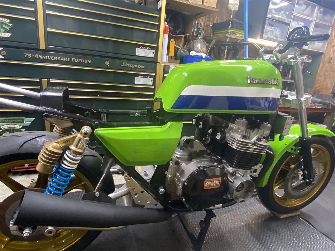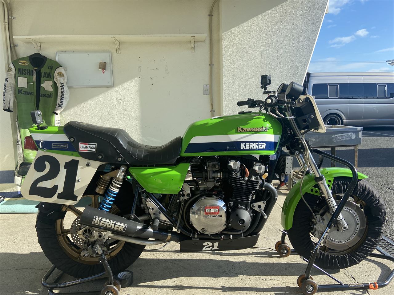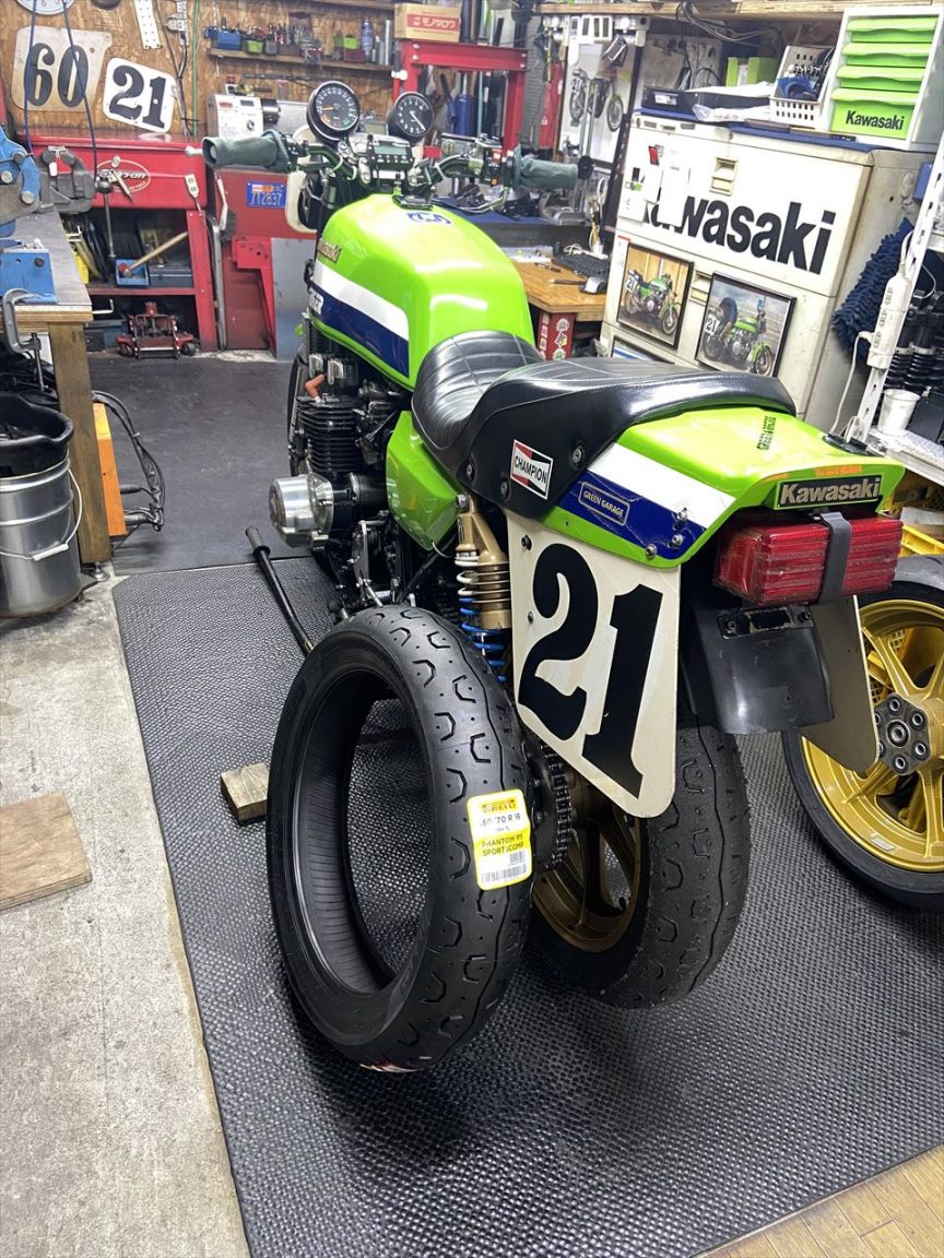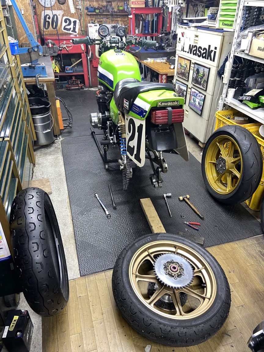 消耗したリヤタイヤを交換します。レース前の練習走行はあと5回予定しているので、レース直前に前後新品タイヤに交換する段取りでちょうどよさそうです。