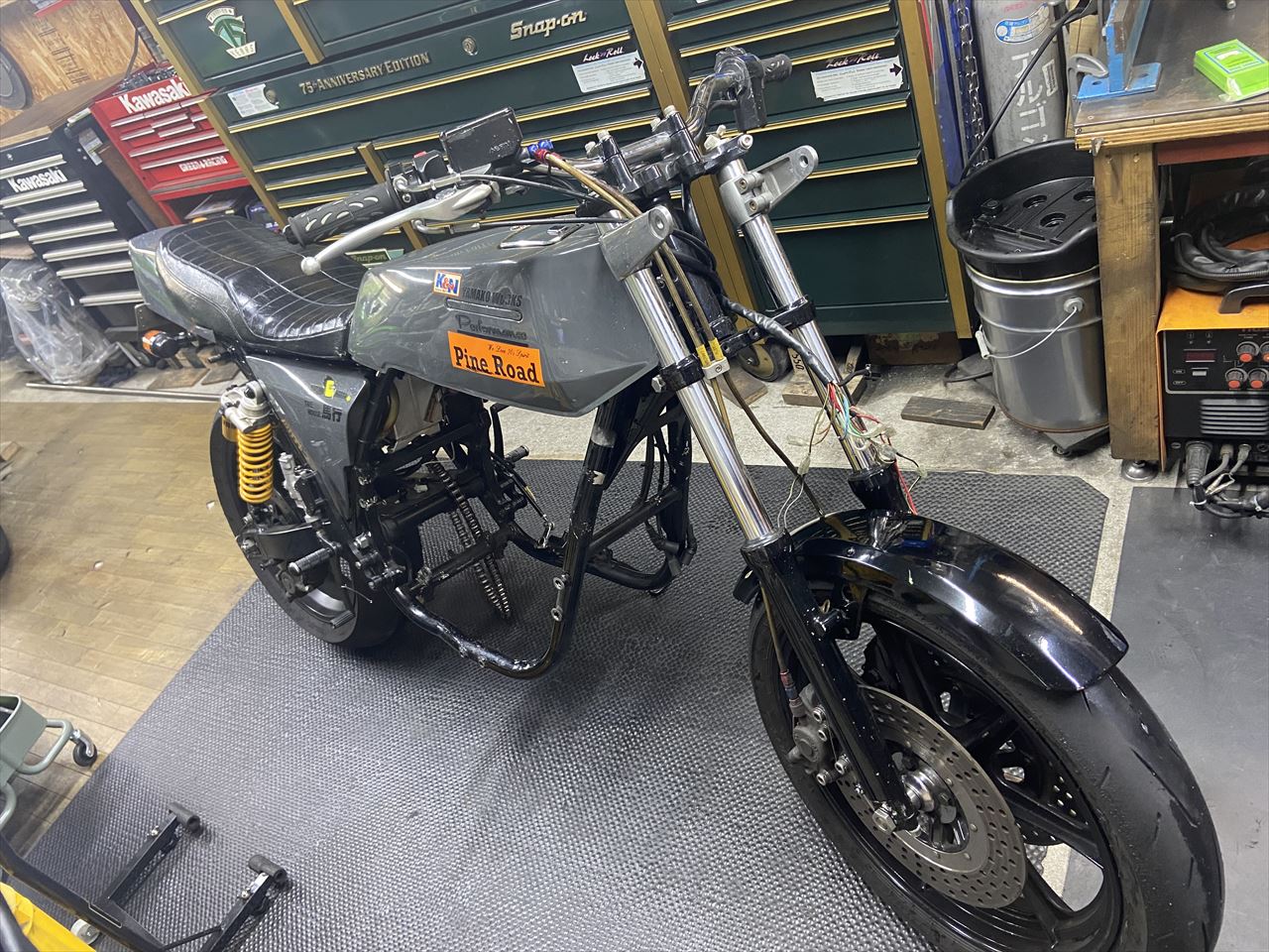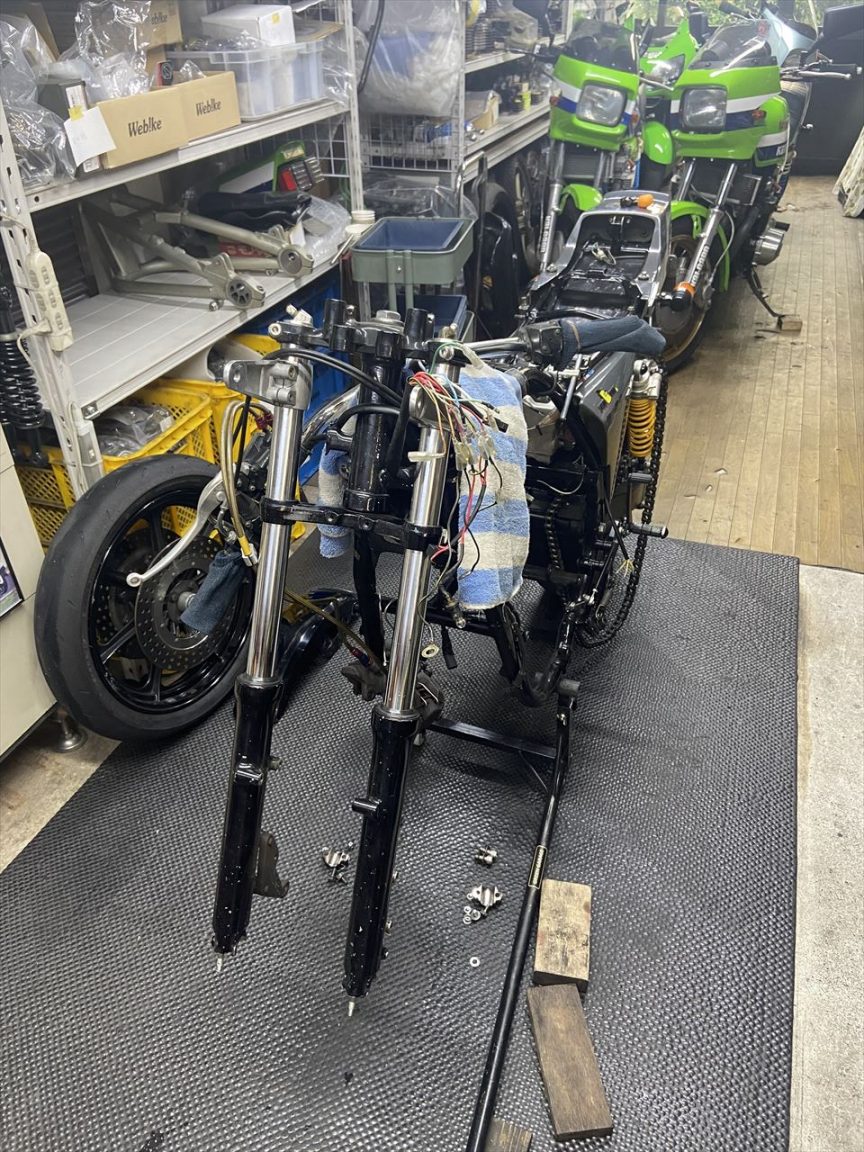 ローターとキャリパーが走行中に接触して発熱し、キャリパーのシールが痛んだようで、フルードが漏れています。スイングアームは初めZRX400改を合わせていましたが、外したので仮に鉄S1スイングアームを付けてあります。