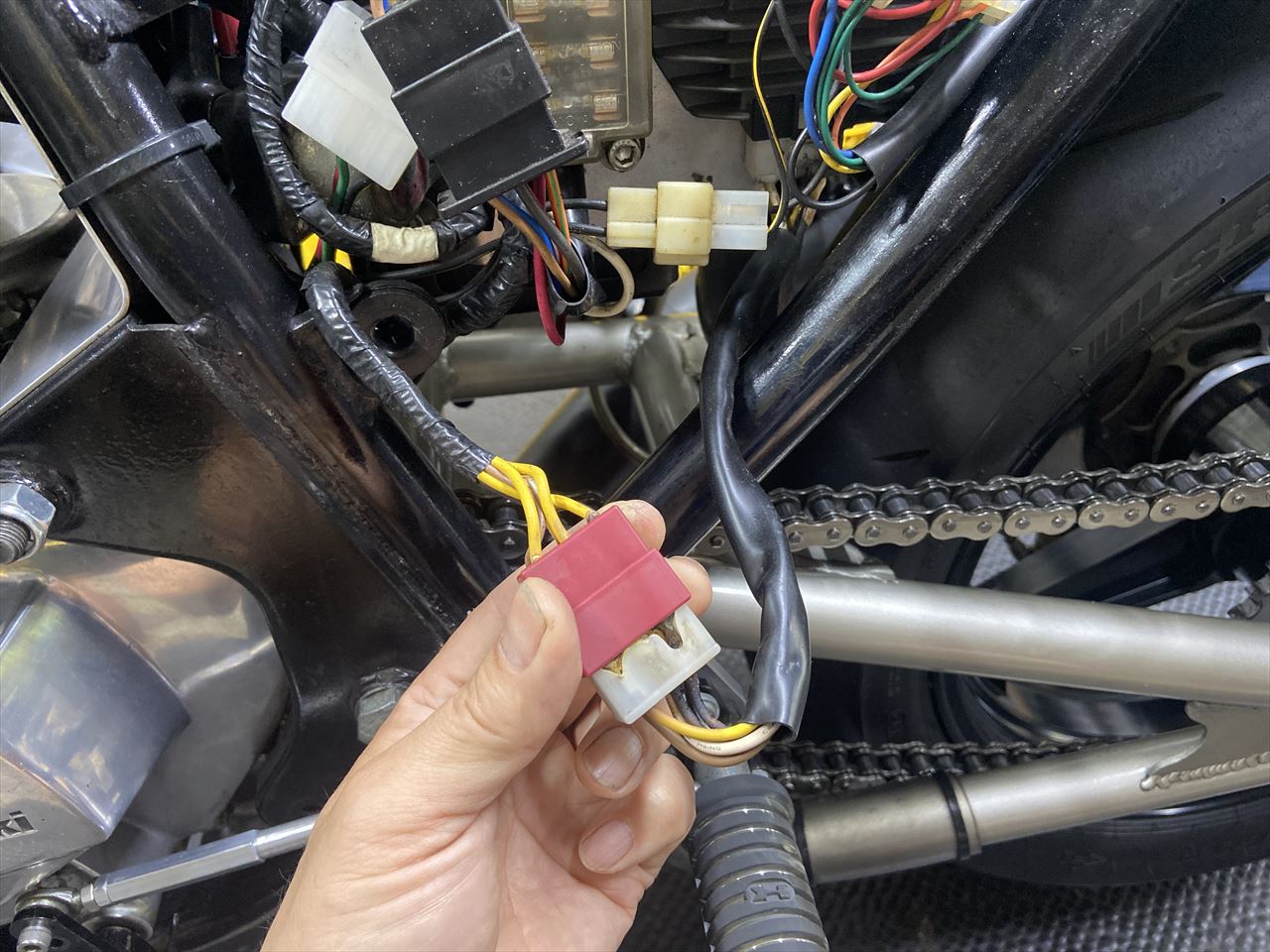 ナイトツーリング先で急にバッテリーが上がってしまったとのこと。かろうじてバッテリーをジャンプして始動できるので、日中にご来店いただきました。